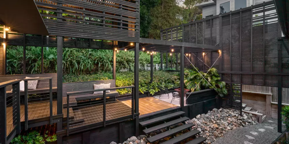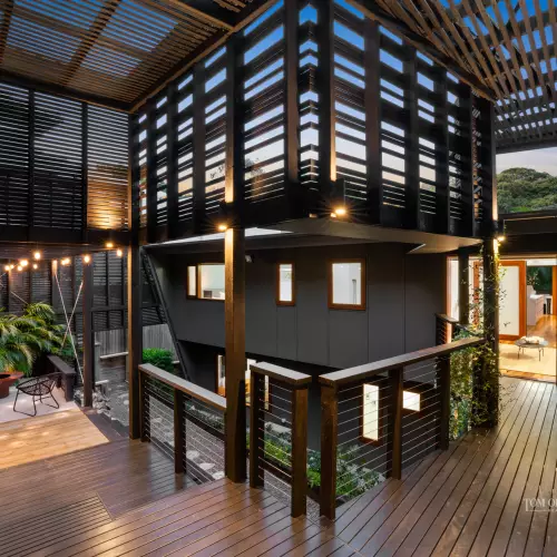 A second living/leisure option is on the southside. For a surprise making a sizeable difference, slide away the doors to an extension by Bark Design Architects revealing several black timber terraces with seating. An internal courtyard is on the ground level.