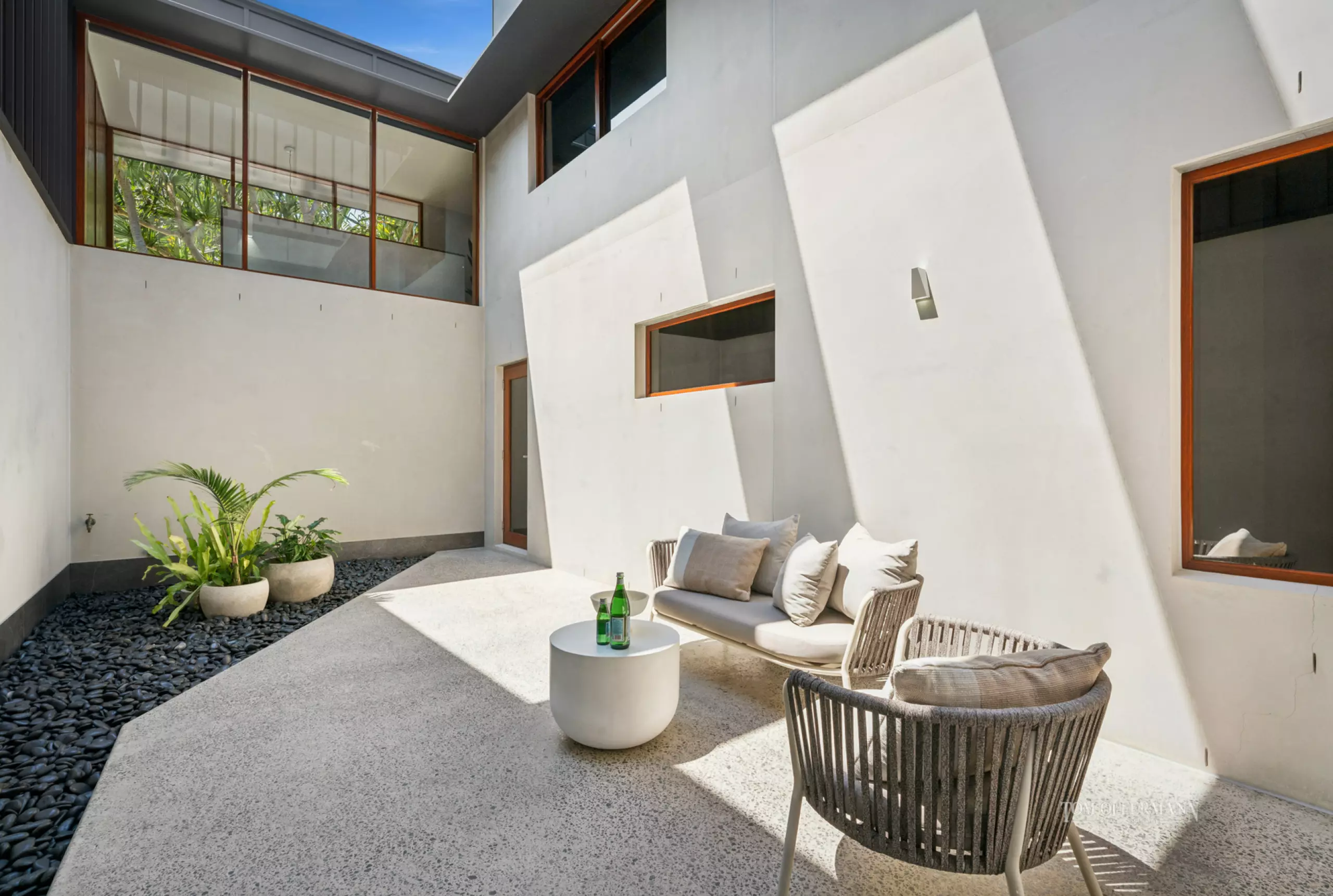 Originally designed by David Teeland, there is a unique sense of playfulness in the open plan living and dining area yet juxtaposed by the monochromatic palette, natural textures and materials including the apt use of polished timber, also grey precast concrete table and walls featuring an eco-gas fireplace and custom cabinetry.