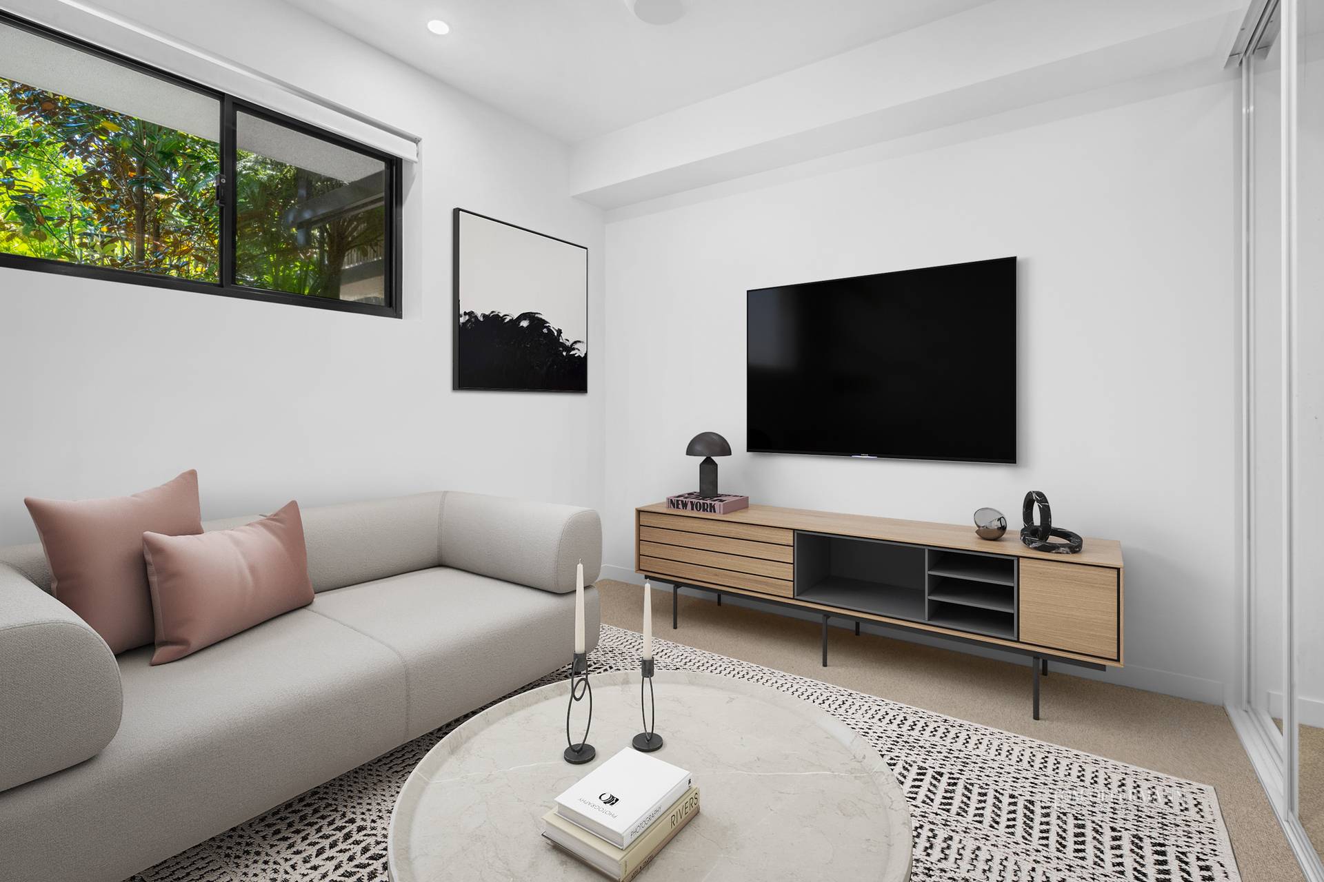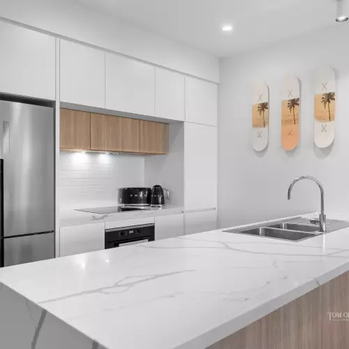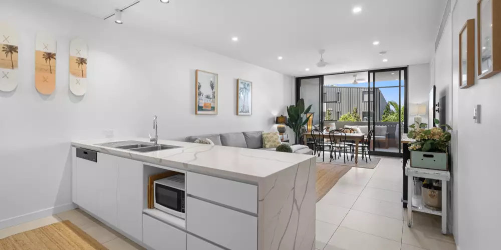 Step inside the apartment and you will immediately be impressed with a sense of spaciousness and natural light with an open plan living area, sleek kitchen, and a soothing beach-inspired colour palette. Sliding doors open up to the large terrace where you can entertain family and friends with serene views across the treetops offering a slice of tranquility.