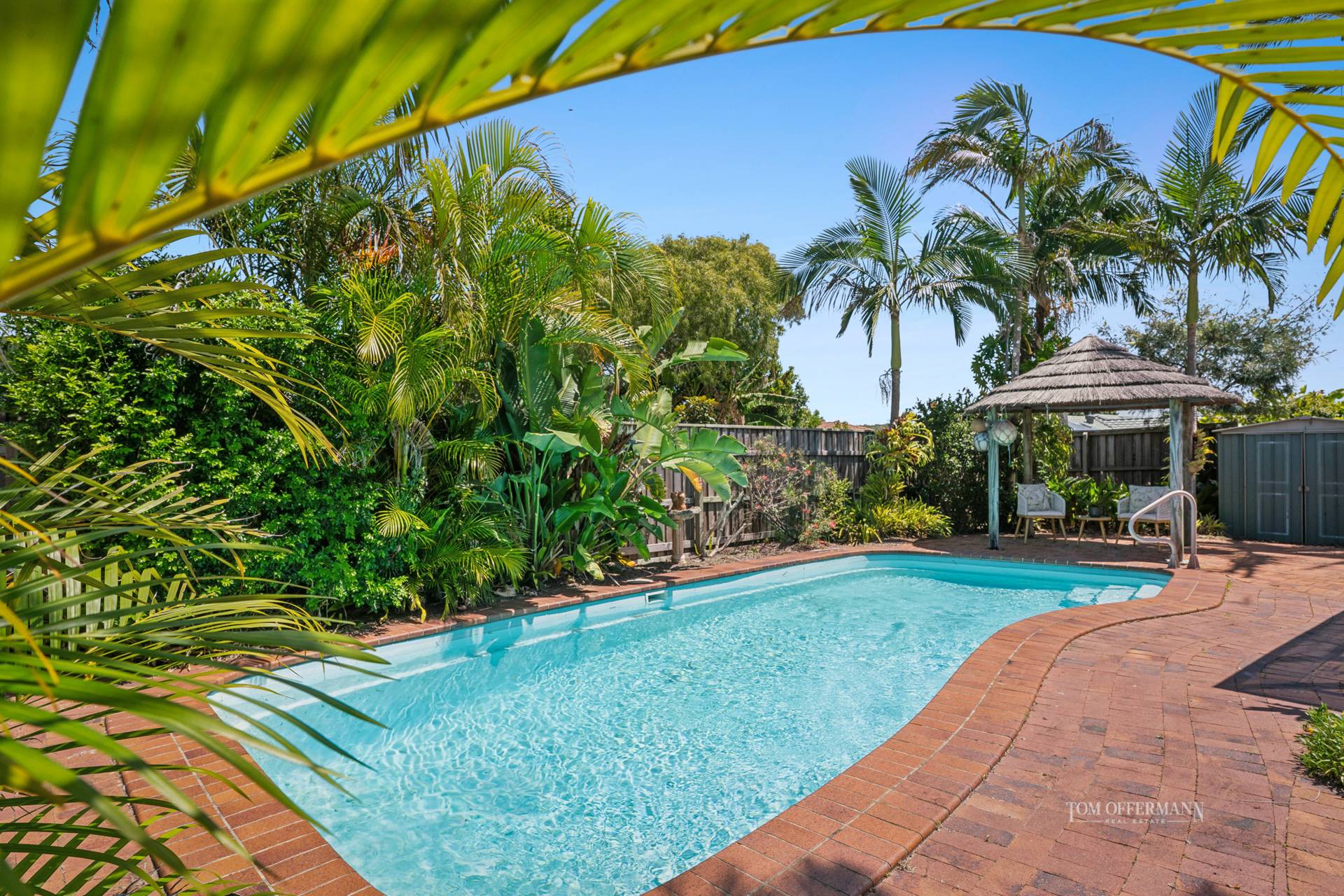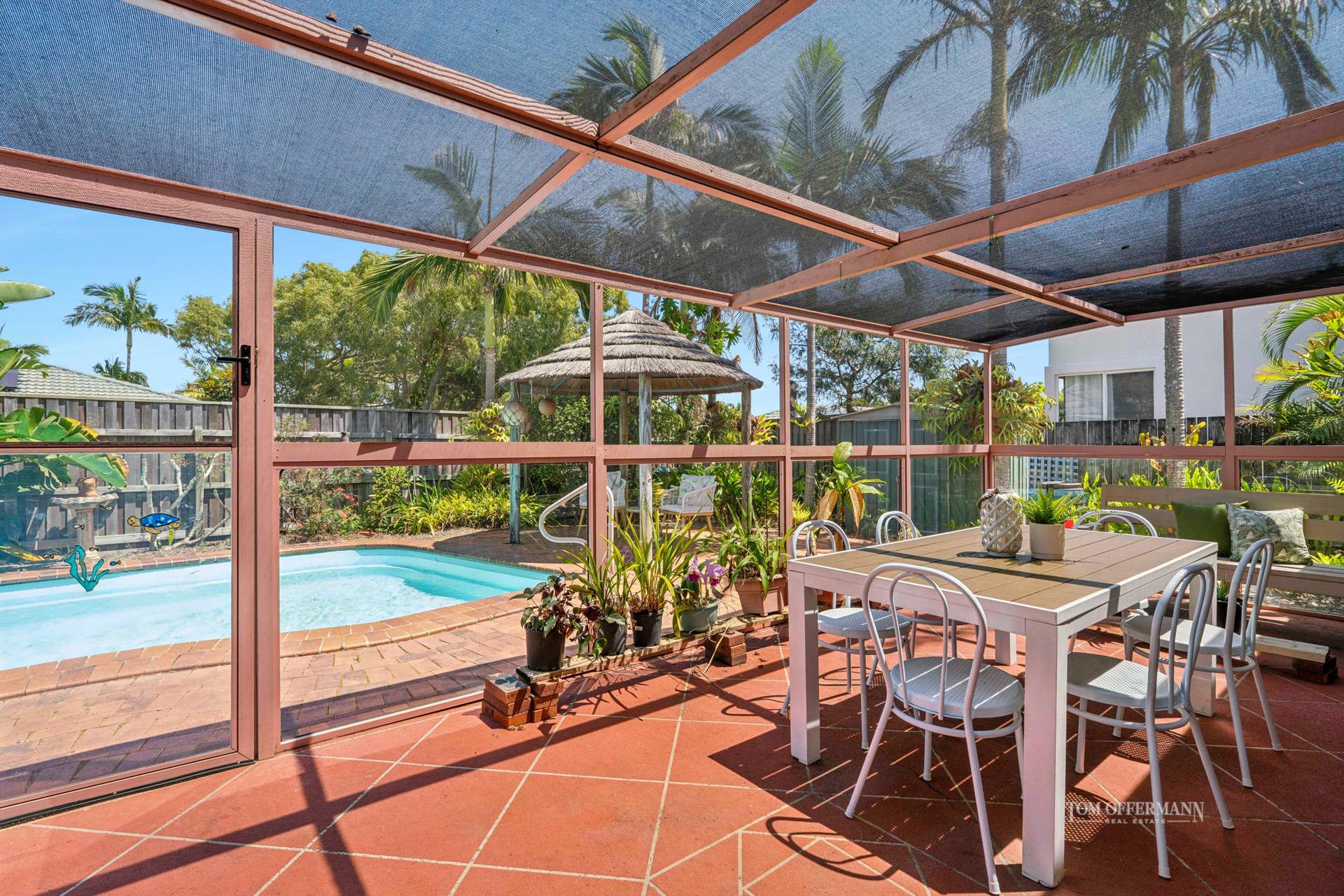 Step outside and you'll discover your own private tropical escape. The lagoon-style pool is surrounded by lush landscaping and features an island-inspired gazebo and indoor sun terrace-ideal for lazy afternoons with a book in hand, a home gym space or a nursery for a hobby gardener.