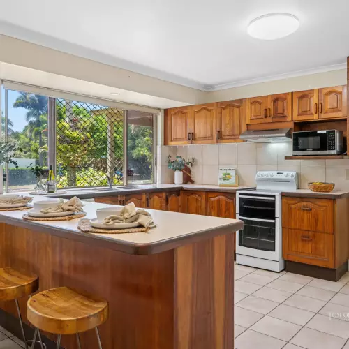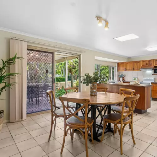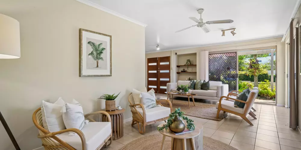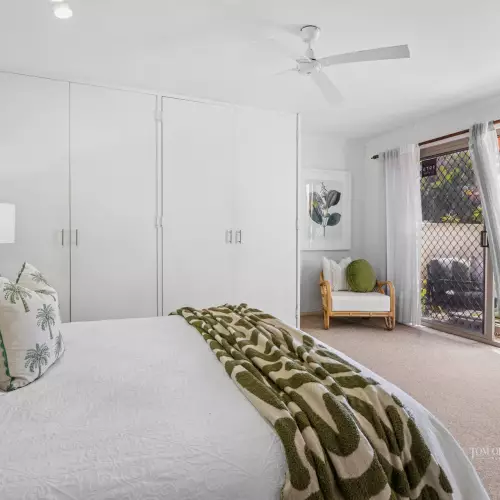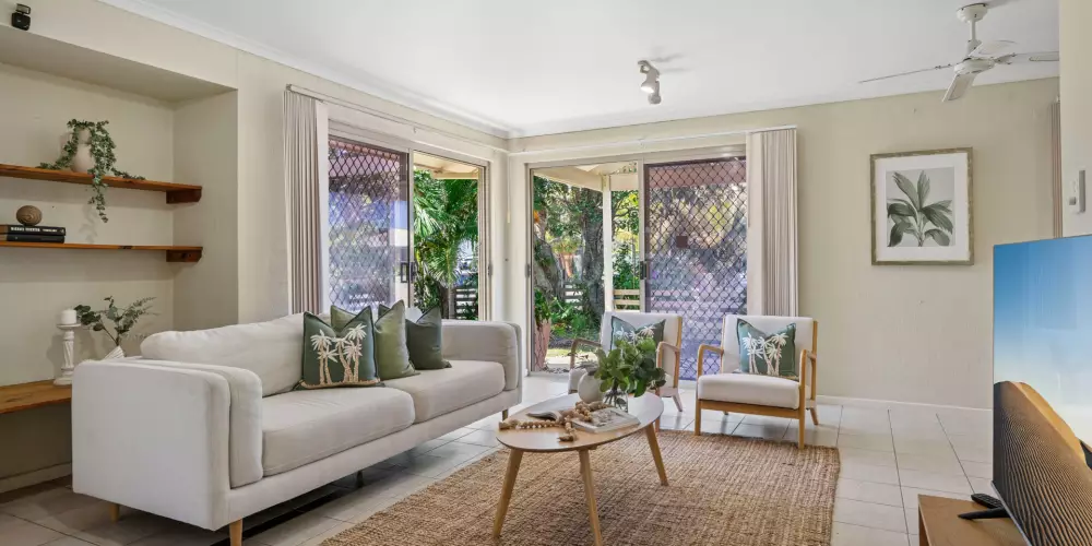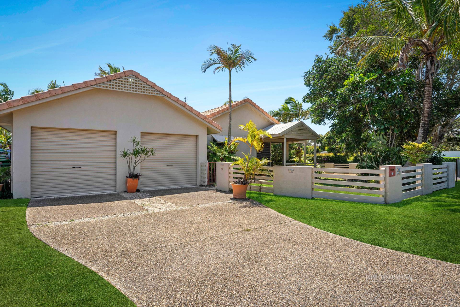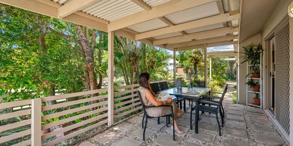 Tucked behind lush sub-tropical gardens brimming with swaying palms and vibrant bougainvillea, this single-level beach house sits proudly on a fantastic, larger than most 793m2 corner block. With its ideal north-facing orientation, the home is bathed in natural light, making every living space feel bright, warm, and welcoming.