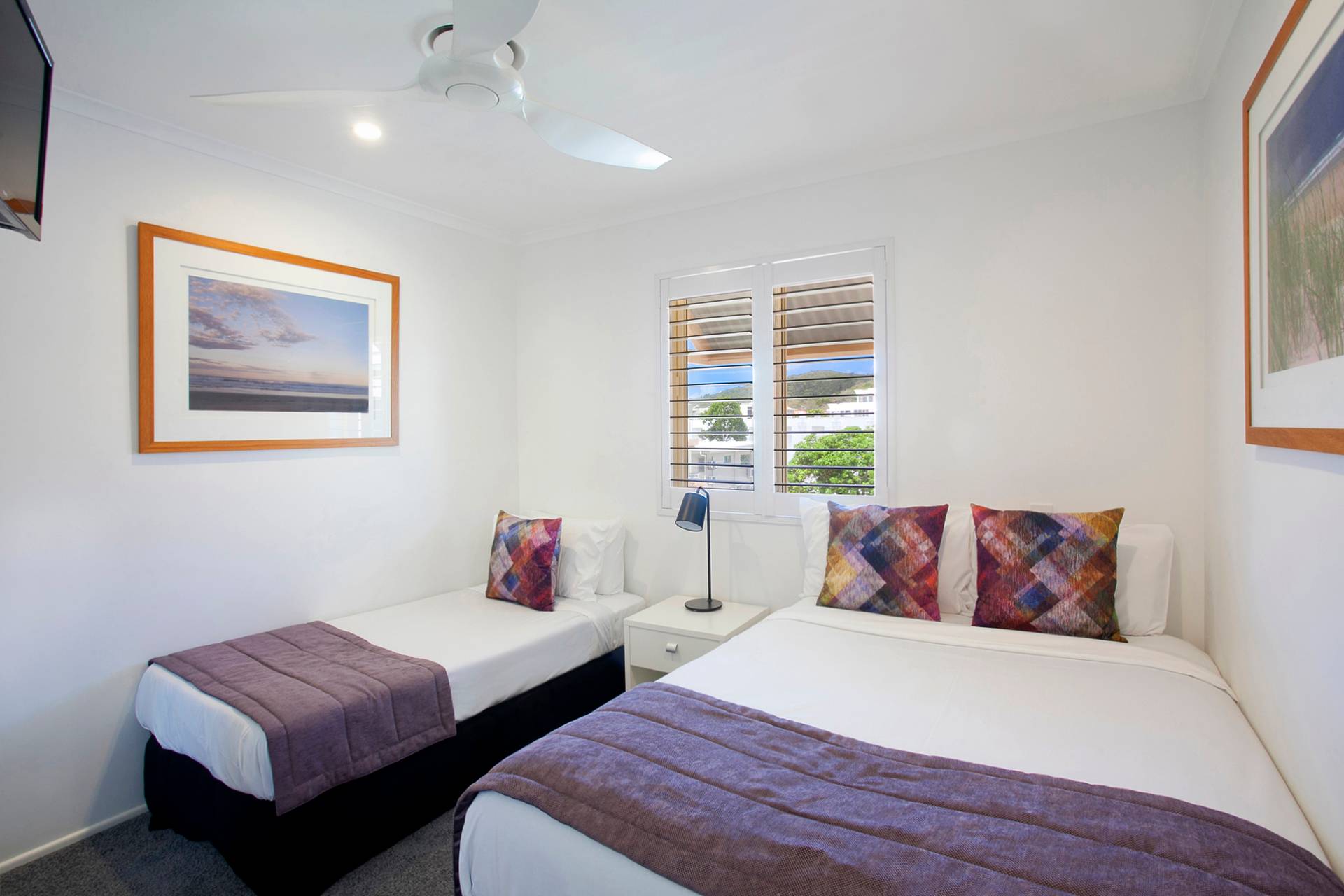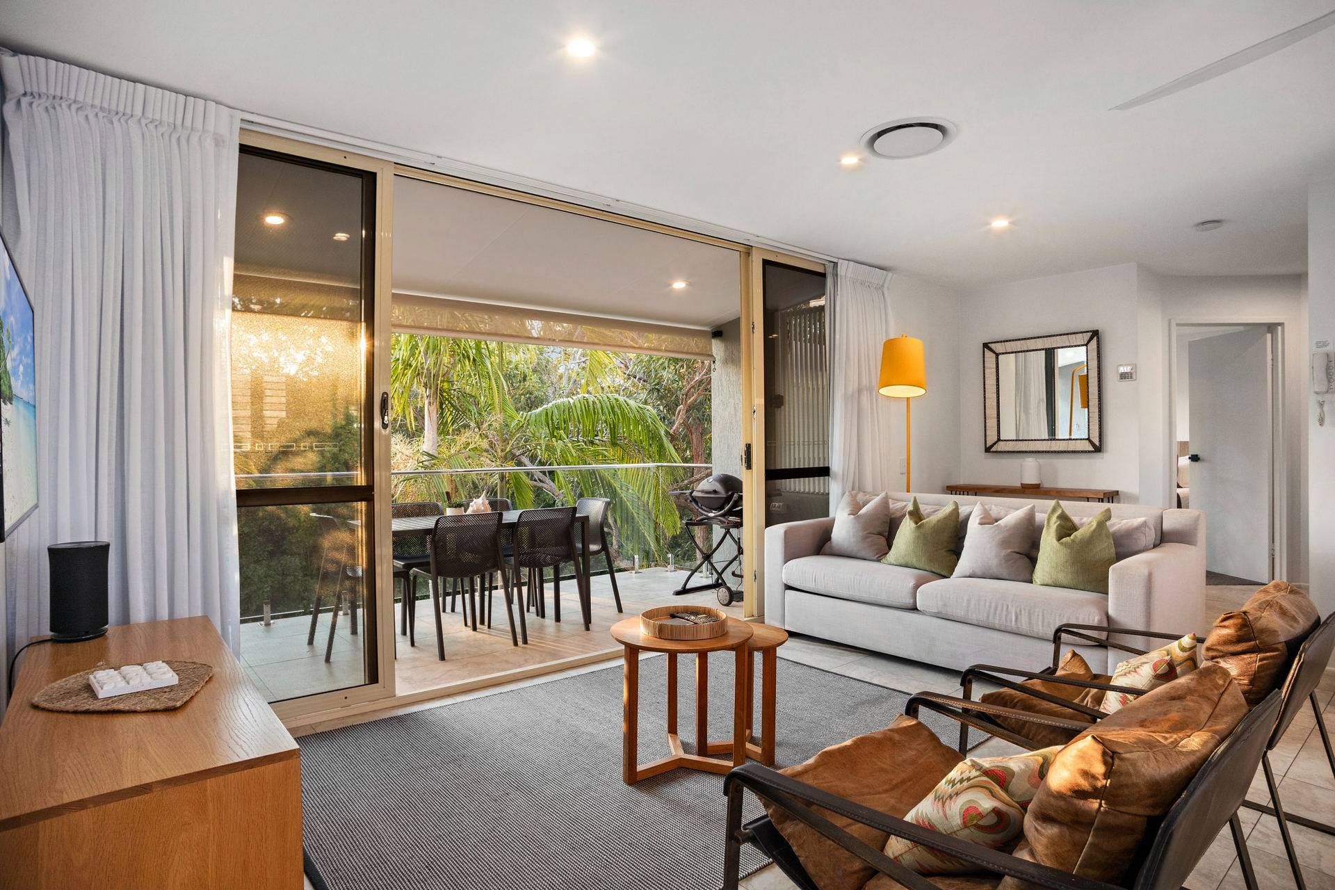 Leave your cares at the door as you enter the spacious apartment with a soft colour palette and open plan design that flows out onto the terrace. The two-bedroom apartment is a self-contained and furnished contemporary gem, with an open plan living space extending to the undercover terrace, has a coastal aesthetic, sandy-hued flooring, plantation shutters and timber look cabinetry.