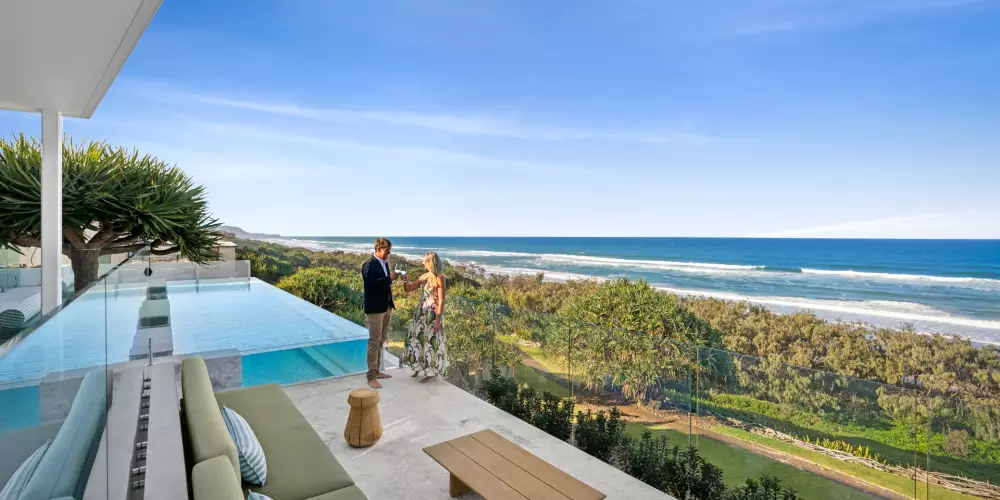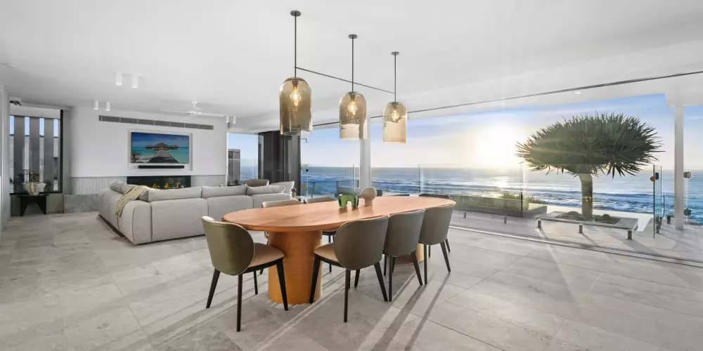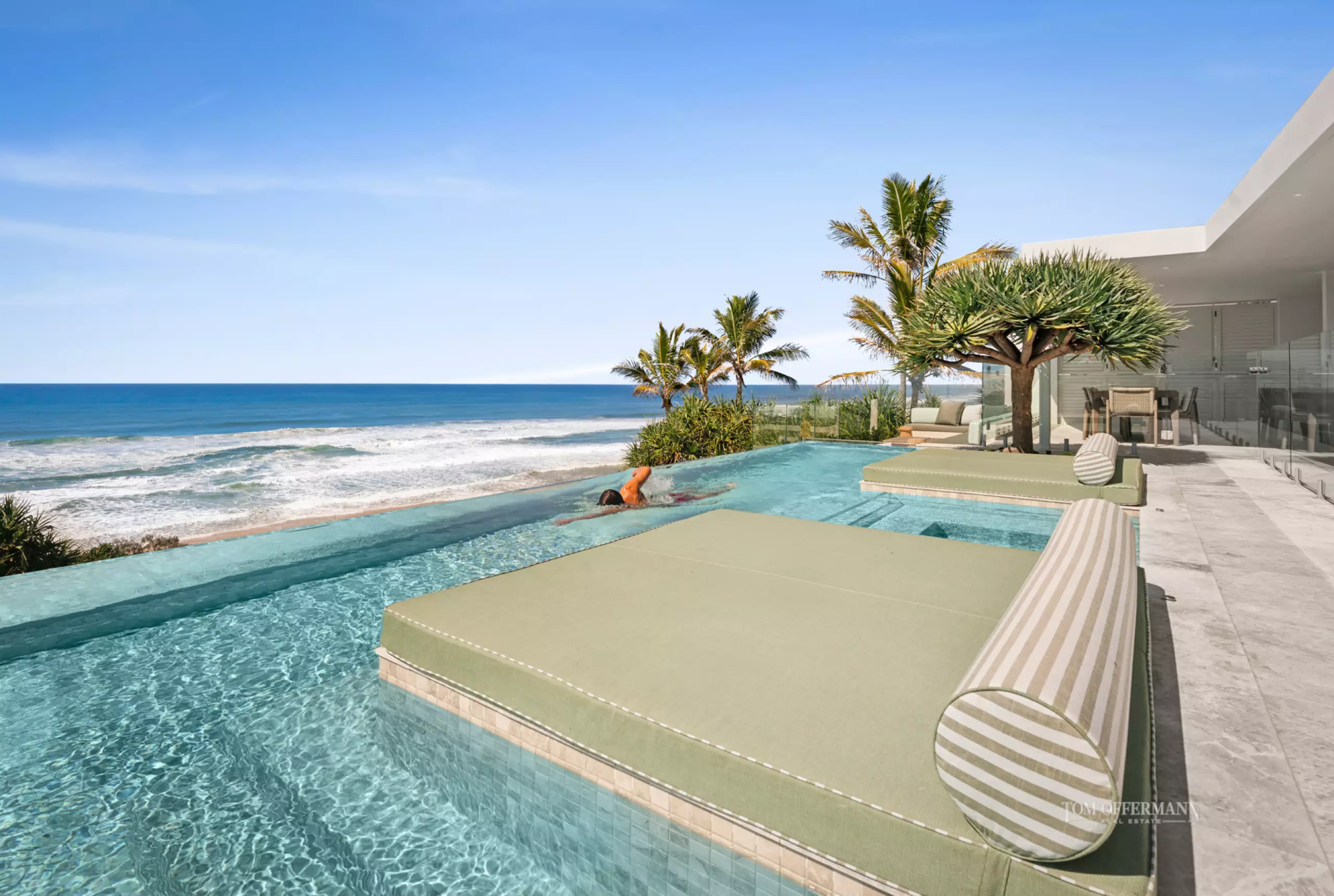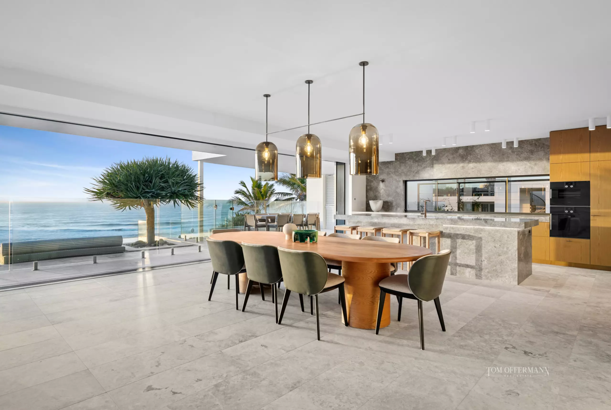The head-turning luminescent pool and spa with lavish custom day beds takes luxuriating alfresco to a new level, as you ostensibly float over the beach and the turquoise Coral Sea. Entertaining whatever the season or reason on the dining terrace with outdoor kitchen is exciting, and a few steps below is the perfect spot for pre-lunch drinks with a dash each of stupendous views and salty breezes.