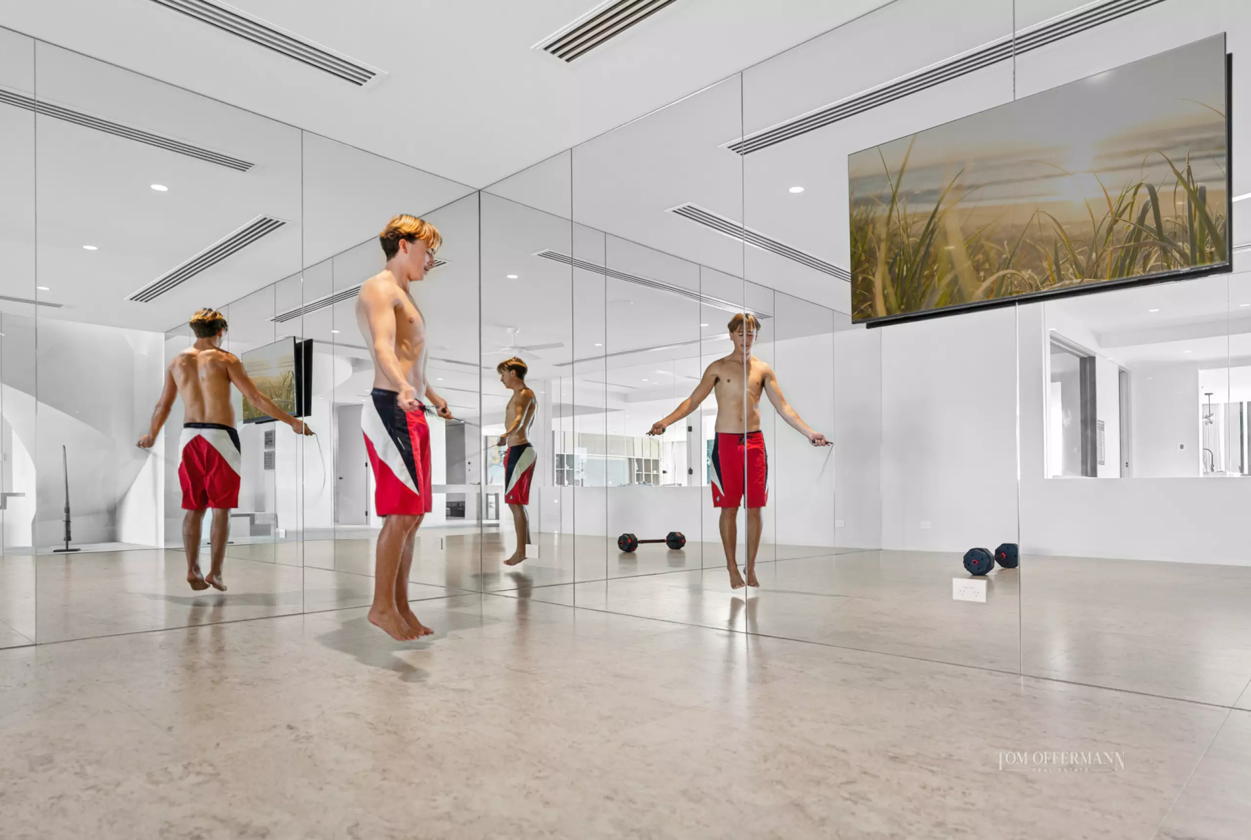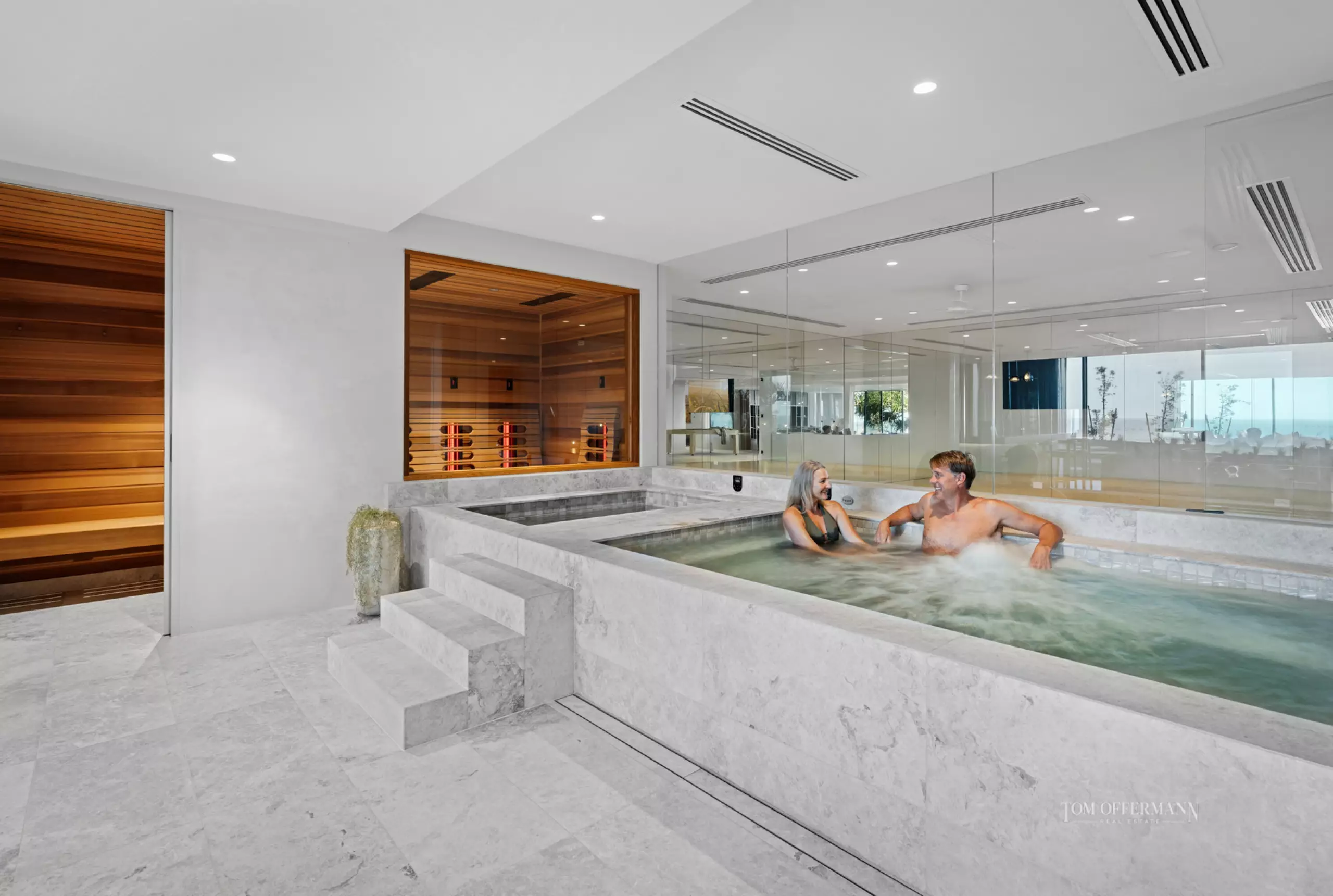 When it comes to casting off its best dress with serves of audacious state-of-the-art spaces, it all happens on the lower ground floor with sumptuous sofas and armchairs for perhaps a cinema experience, a game of pool, a serious wine bar and temperature-controlled cellars, plus a big nod to boujee wellness, with a mirror-walled gymnasium, change room, full size spa as well as an ice bath beside the 5-seat infrared sauna.