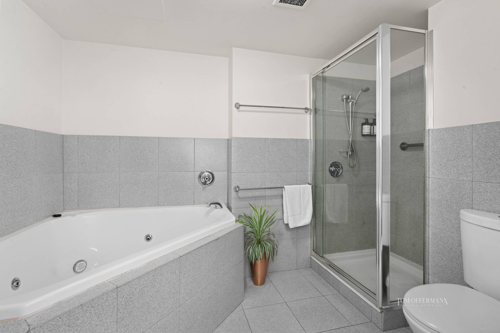 The spacious kitchen includes ample storage and all the essentials: oven, dishwasher, microwave, and plenty of bench space with seating. Both bedrooms are carpeted, with built-in robes and ceiling fans, while the master features an ensuite complete with a spa bath. Additional highlights include a split-system air conditioner in the living area, an internal laundry cupboard with washer and dryer, and secure basement parking with lift access.