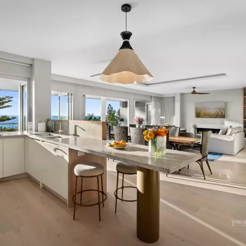 The kitchen is a chef's domain elevated to an entertainer's dream. Sleek cabinetry conceals generous storage, integrated appliances whisper rather than shout, and a statement island bench anchors the space - a stage for morning coffees, late-night conversations, and the clinking of glasses when friends gather. Every angle is carefully considered so that even from the heart of culinary creation, the ocean is your constant backdrop.