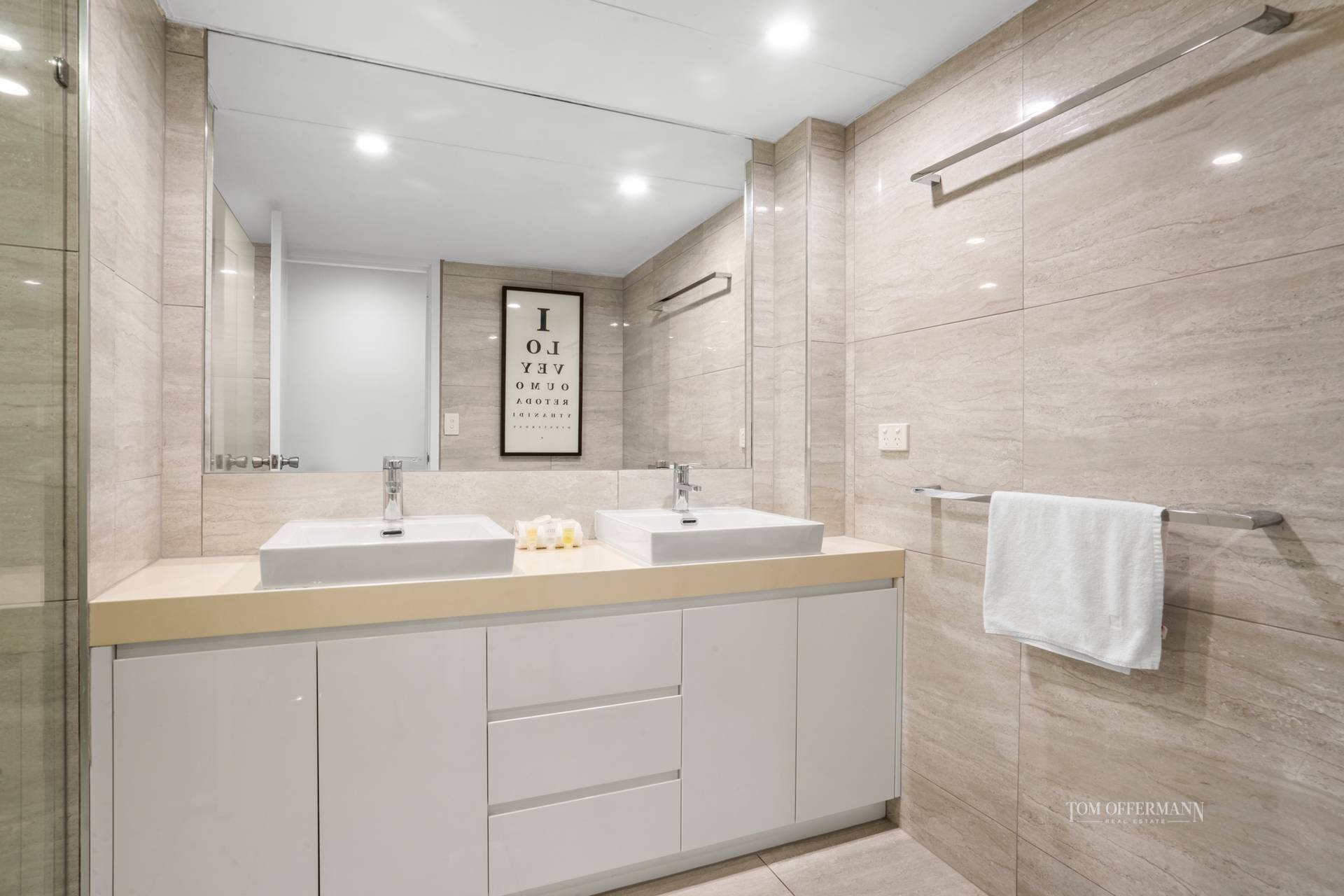 Sweet dreams are guaranteed in the three carpeted bedrooms with plantation shutters, built-in robes and cool white styling. The main bedroom has an ensuite, and two bedrooms share a bathroom with marble look tiles and cream stone and two-basin-topped cabinetry.