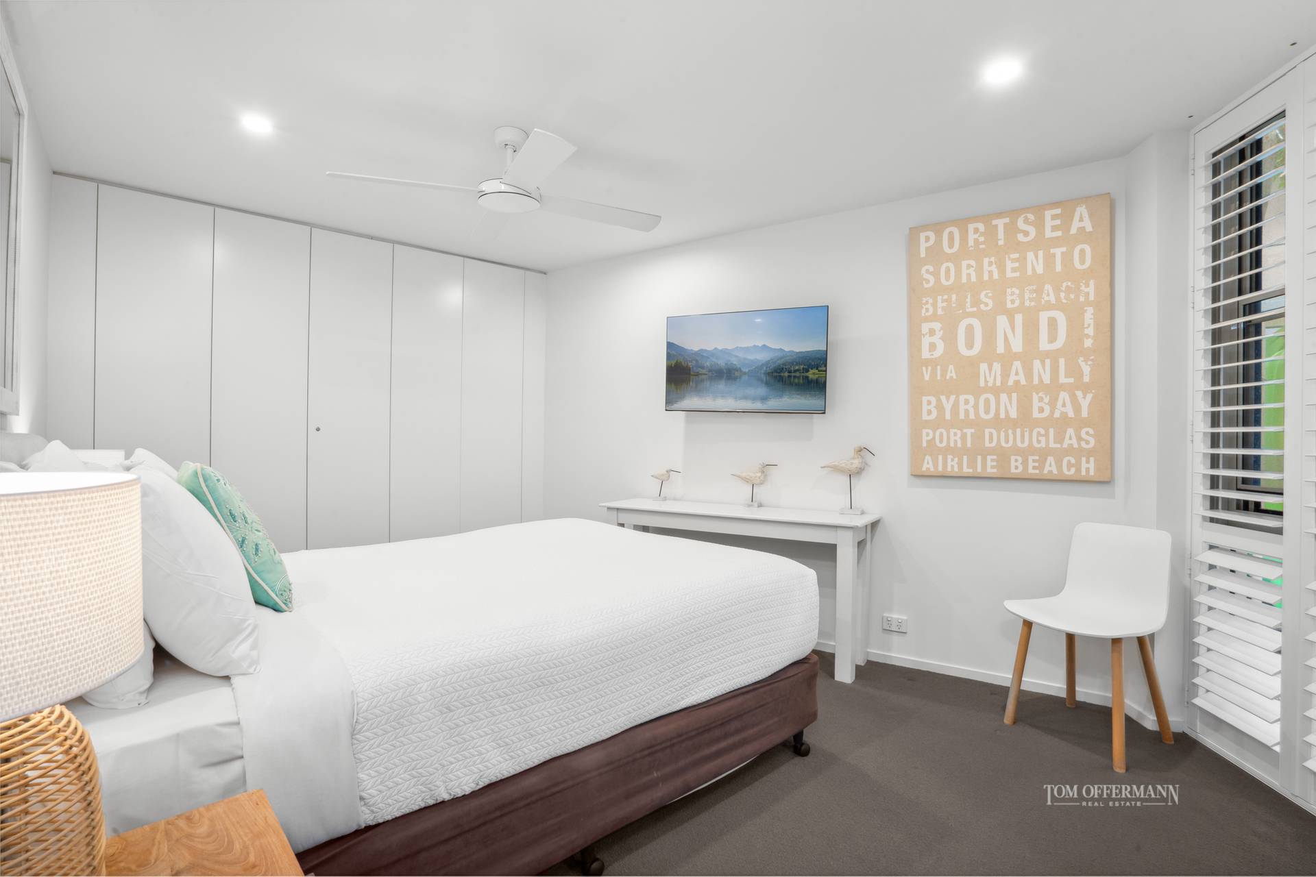 • About: recently renovation; white marble-toned tiled flooring; modern beachy artworks, framed artifacts, seaside signs, mirrors & plantation shutters; aircon; open plan living w 2 contemporary muted grey fabric sofas, armchair & ottoman; glass topped coffee table; natural hued rug; timber console & TV; timber dining table w 6 white chairs; curtains & sliders to outdoors; 3 carpeted bedrooms w plantation shutters & built-in robes; main bedroom w ensuite; 2 bedrooms share bathroom w marble look tiles, cream stone & 2-basin-topped cabinetry; laundry w Fisher & Paykel washer & Simpson dryer