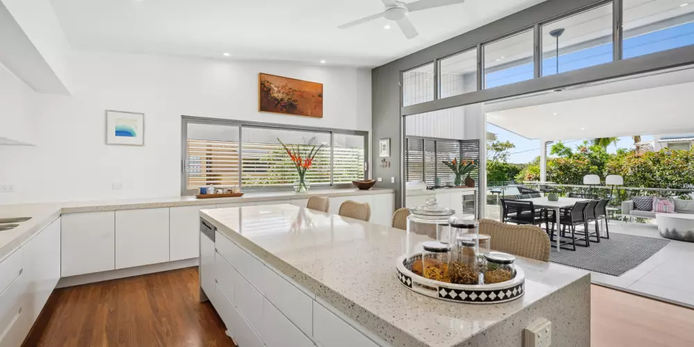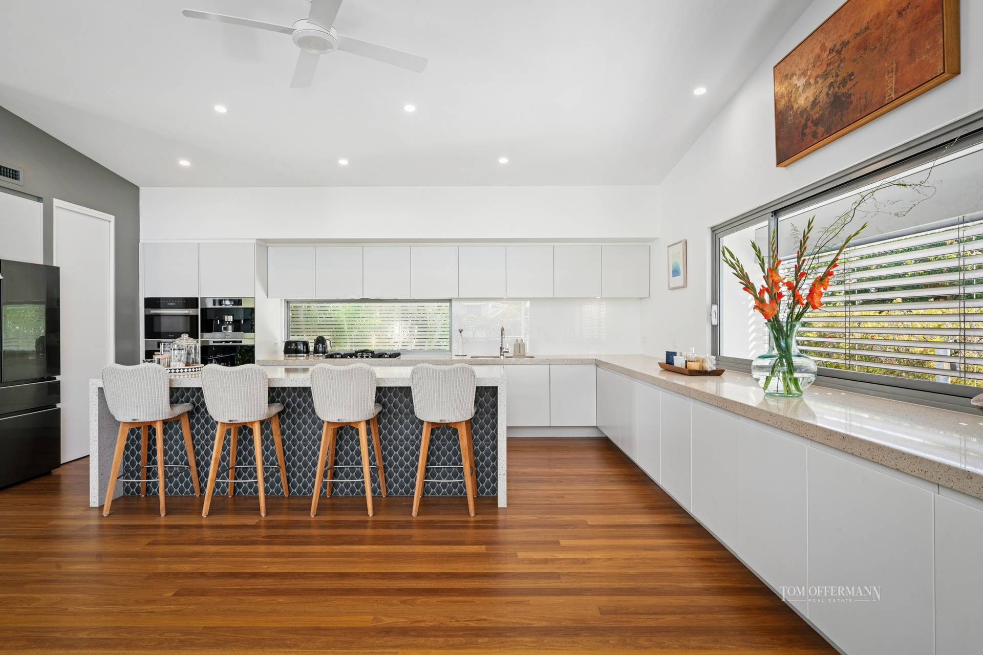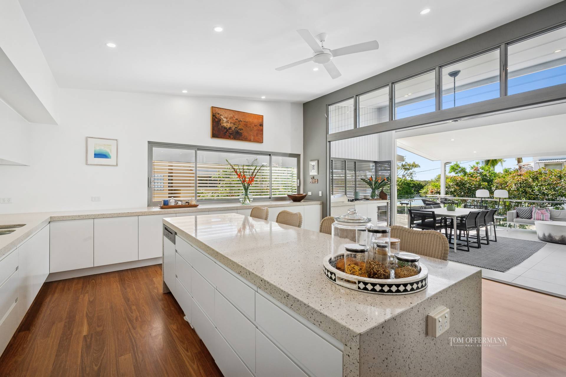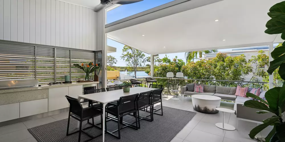 Stepping outside onto the covered alfresco area, discover a private entertaining zone complete with an outdoor kitchen, perfect for hosting family gatherings or simply to relax with a view of the Noosa River while the kids swim in the gorgeous swimming pool below.
