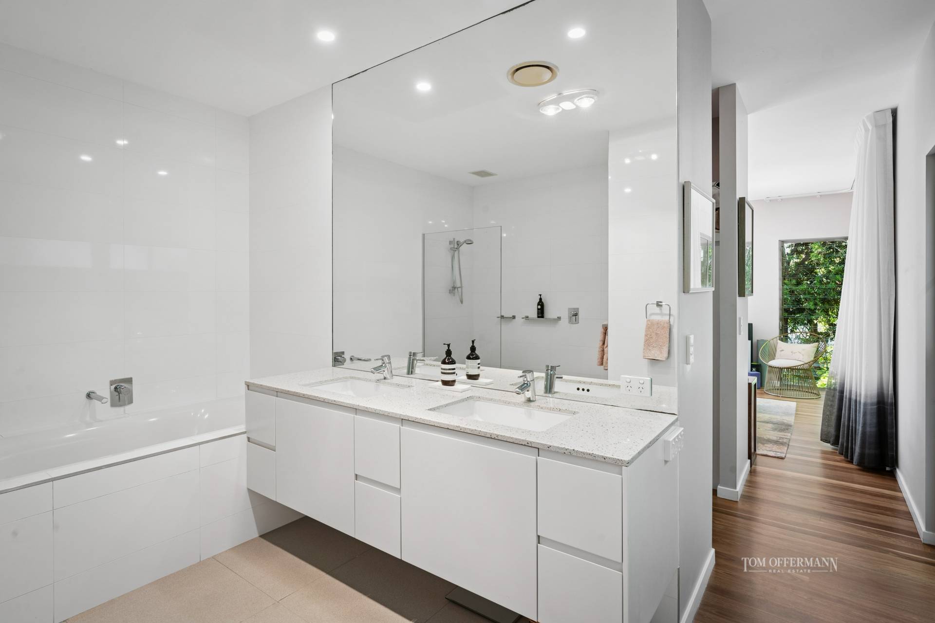 As you approach the property, the home's elegant exterior with inviting entry and striking contemporary features hint at the stylish interior that awaits you. Head upstairs to the open plan living area where warm neutral tones, soaring ceilings, timber flooring, and an abundance of natural light will take your breath away.