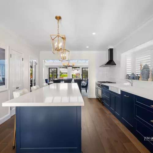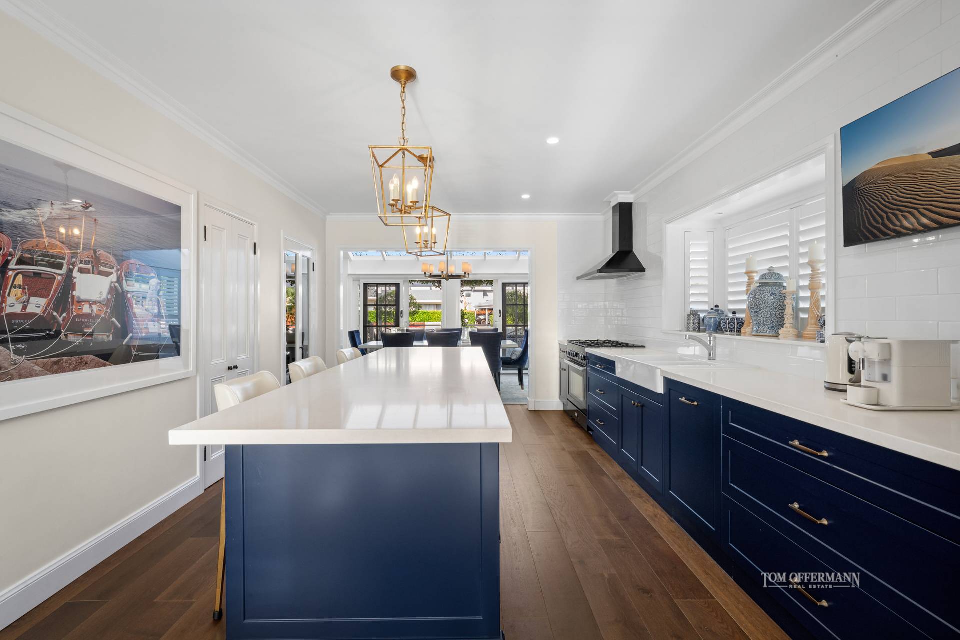Retro rocks in the shaker-inspired kitchen with white stone-topped royal-blue cabinetry including large island breakfast bar, brass lantern pendants, double farmhouse sinks, walk-in pantry plus store room, and high-end appliances such as a 900 Falcon gas cooktop with oven. Adjacent is a meals area, also a laundry with sink.