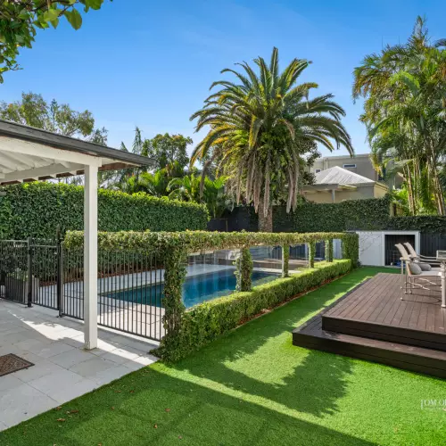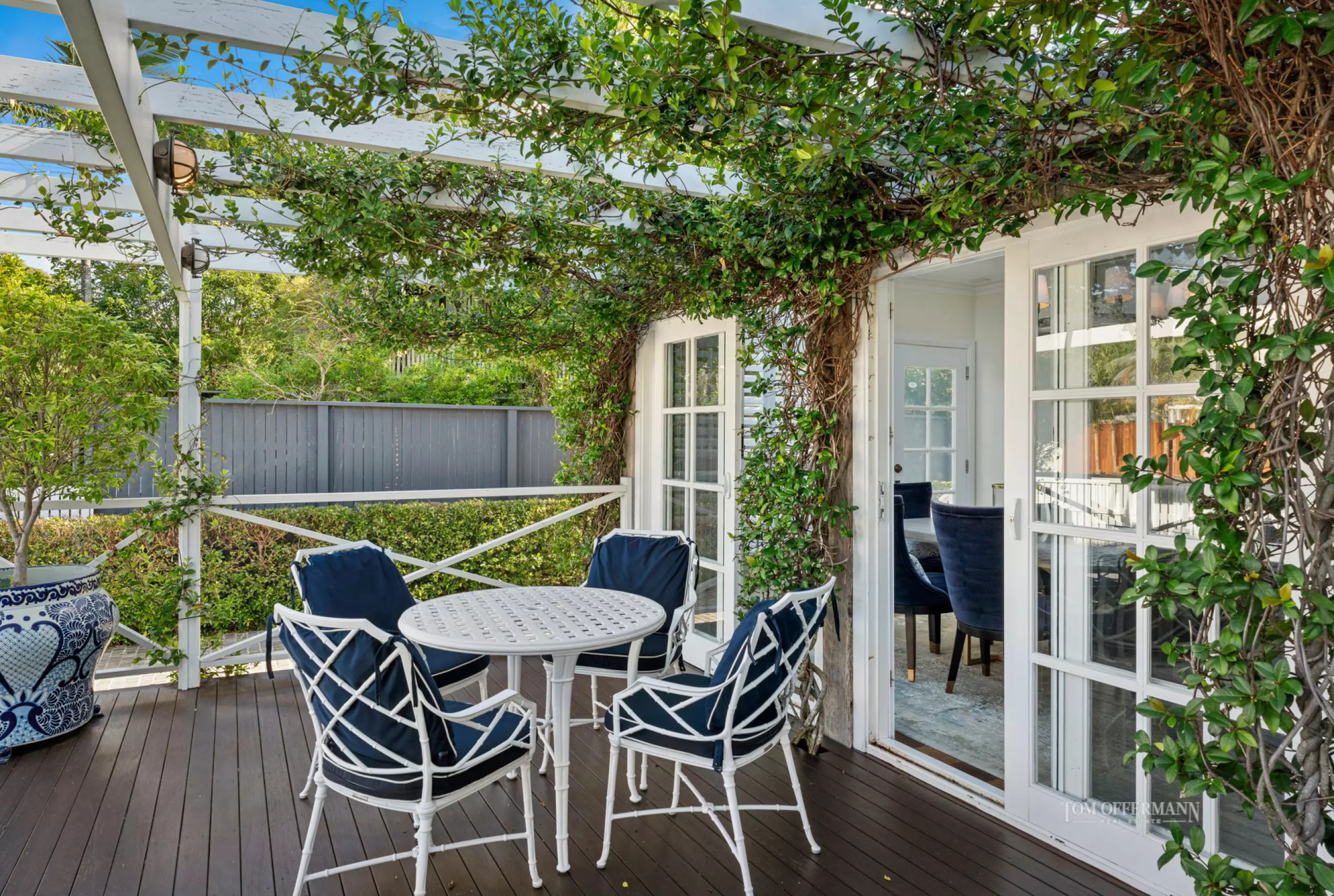 Awaiting sunseekers and families is a lush oasis, the north-westerly back garden. There's a nod to Palm Springs, with a giant Bahamas palm, manicured low maintenance plantings, jasmine-espaliered glass pool fencing, also a pavilion - more an outdoor room.
