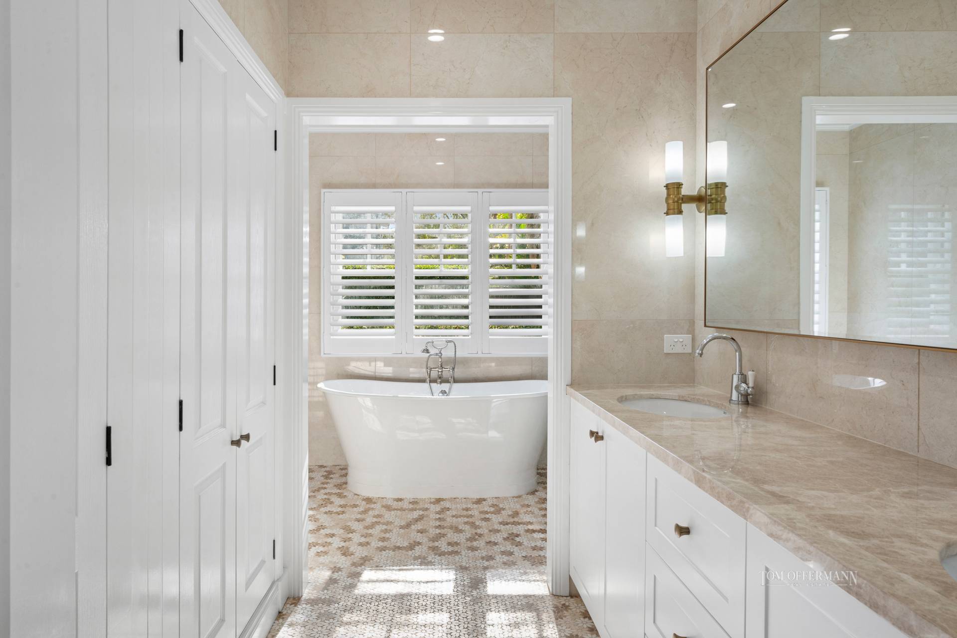 There are four roomy bedrooms. In the north wing on the ground level is the premier king suite with walk-in and built-in robes. The ensuite has nickel tap ware, marble mosaic tiles, marble topped two-basin classic white cabinetry, large shower plus freestanding bathtub. The second bedroom with walk-in robe, bathroom has a shower and single basin cabinetry.