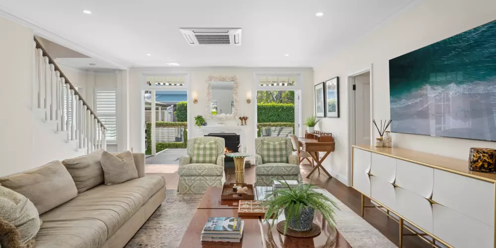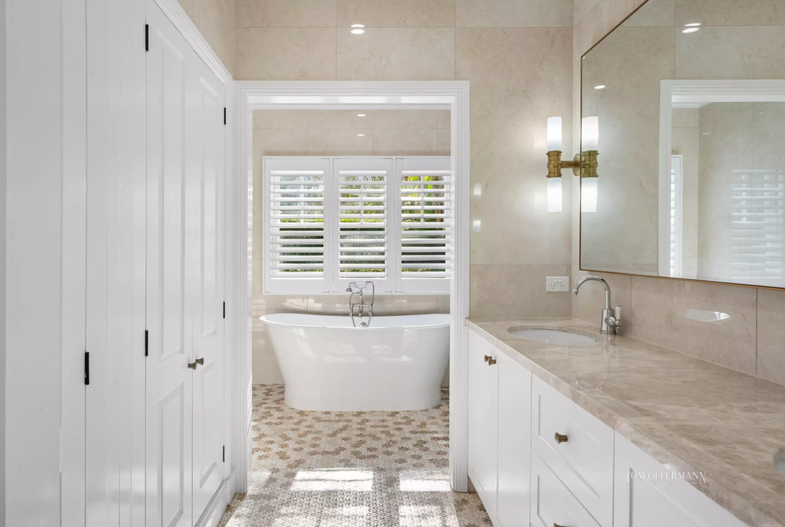 From the quiet cul-de-sac, the residence with American-style white clapboard exterior looks captivating. And for good reason much-admired. Open the double glass-paned front doors of the wide verandah into the foyer. Look ahead and marvel at the high ceilings, architraves and deco-inspired light sconces in the generous living room.