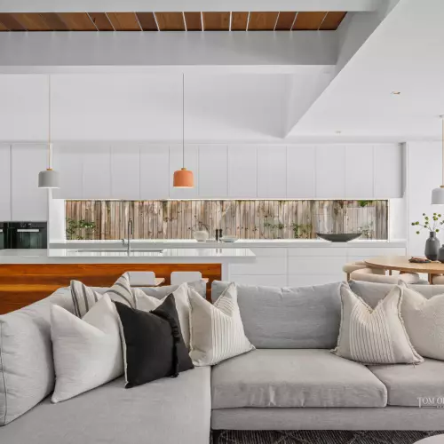Open the statement door and all becomes obvious. Indulging definitive flair are lofty ceiling heights, and an extensive use of glass with banks of louvres and disappearing doors in the over-sized living and dining spaces. Maximising breezy and bright natural light it seemingly invites itself in to shadow-samba over ash timber flooring, even the stone feature wall in muted shades of grey.