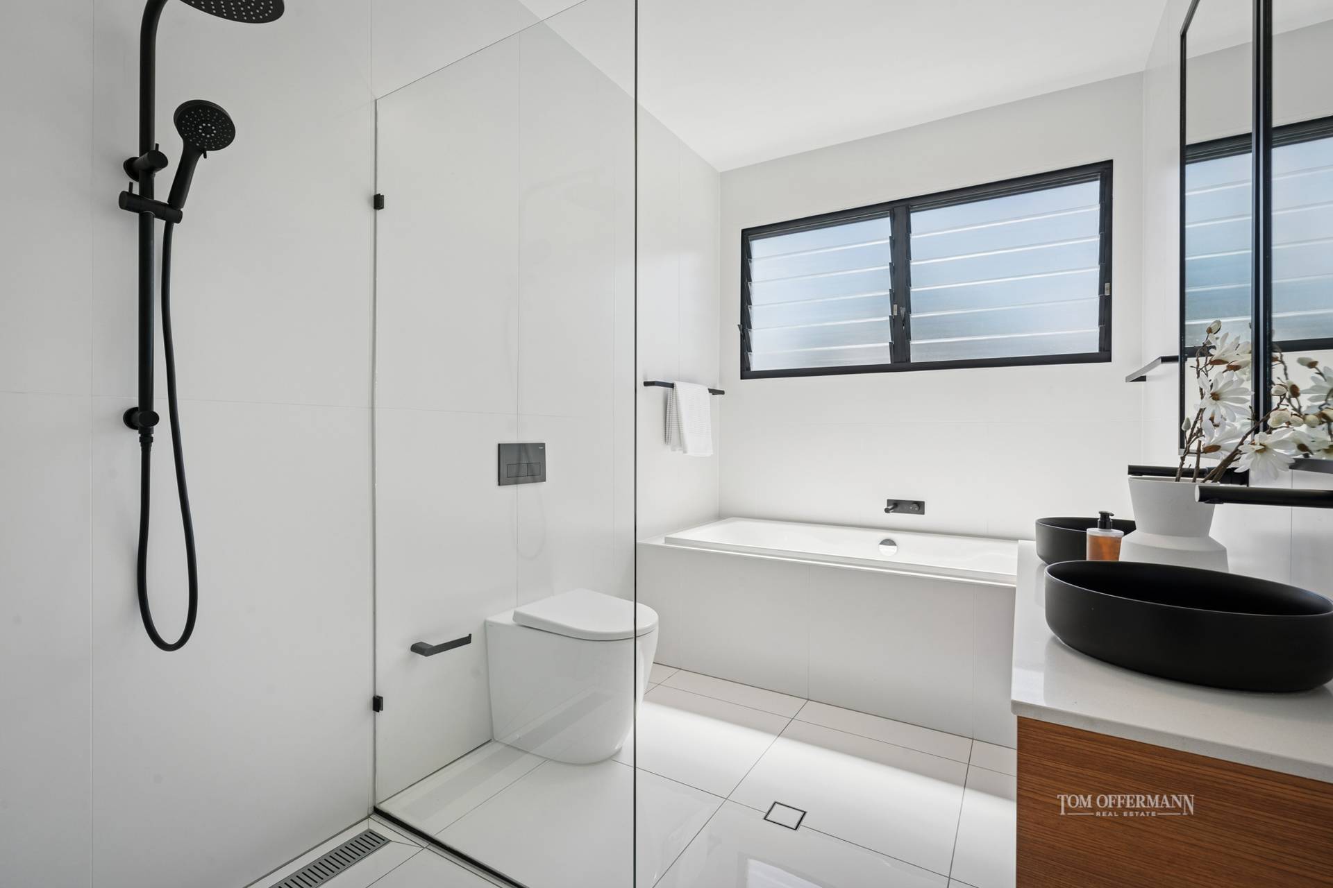 Other notable features include split system air-conditioning to all bedrooms and ducted air-conditioning on ground level; Telsa solar power; floor to ceiling tiles, dual vanities, and full-size bathtubs in both bathrooms; brand new hardwearing double loop carpets on upper level and hybrid flooring on ground level; abundant storage including garden shed; and 2 x water tanks.