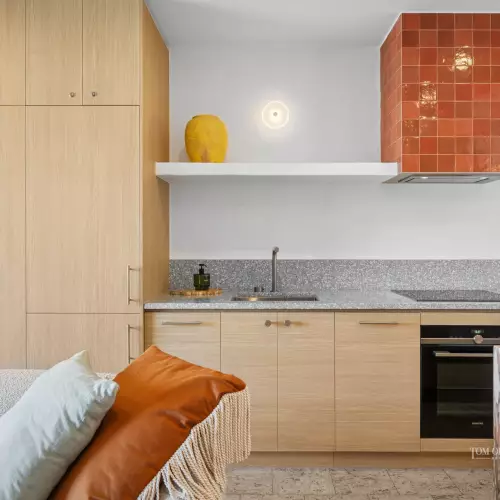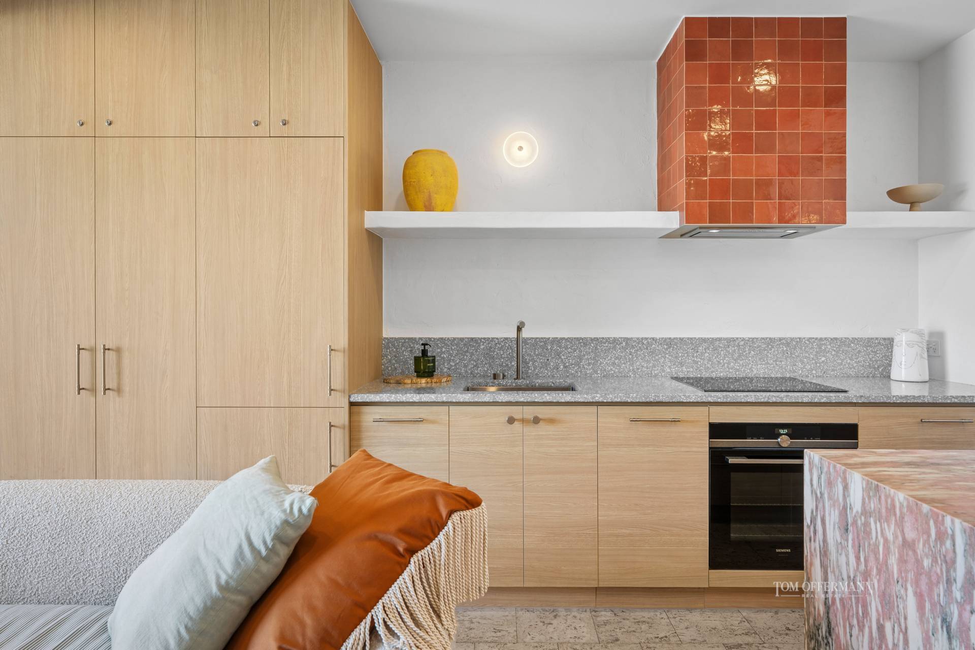 • Kitchen: galley-style w grey terrazzo-topped oak cabinetry incl lower & floor-to-ceiling; upper open shelving w feature russet tiles around rangehood; marble semi-island breakfast bar; Siemens oven, cooktop & integrated fridge; Miele dishwasher