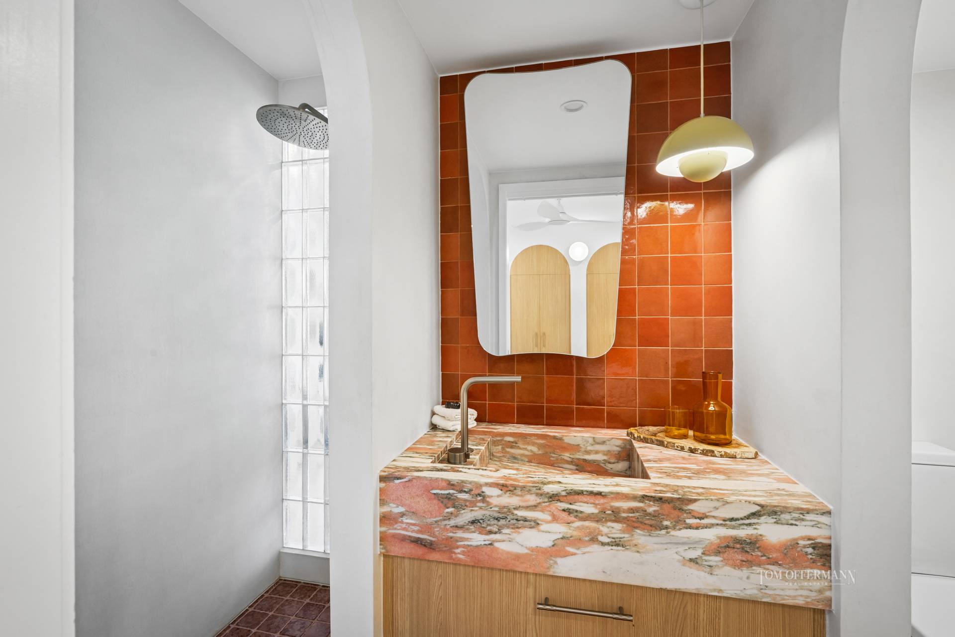 • Bedroom: curvaceous bedhead & white side tables; BIR w curved oak doors; ensuite w marble custom basin-topped oak cabinetry; russet wall tiles w designer mirror; drencher shower & wall w glass bricks