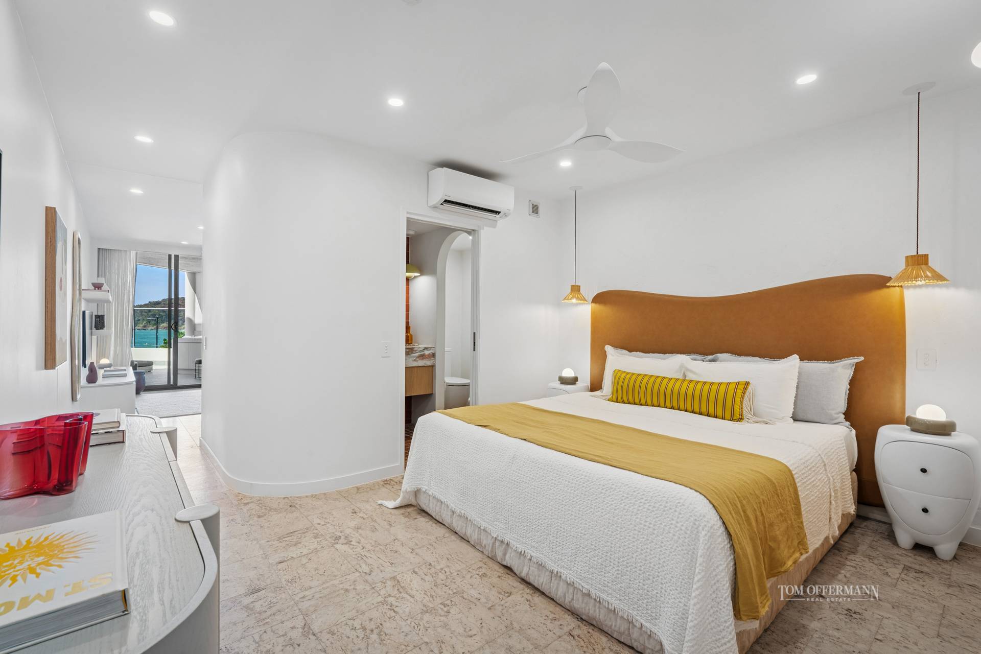 Wispy linen sheers catch the breeze, natural light bounces shadow-like over the cork flooring, curved features are aplenty including the sumptuous white boucle sofa, custom console, designer mirrors, and all complemented by pendants, artifacts and accessories.