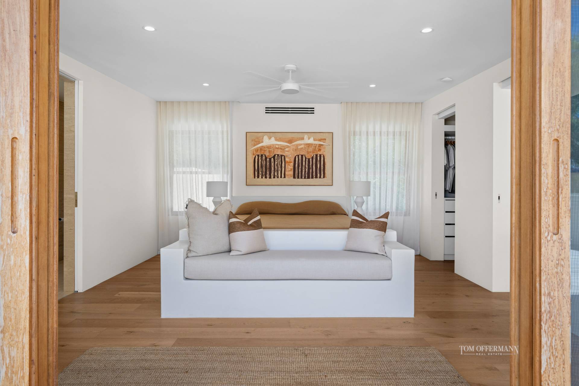 Thoughtful modern inclusions continue throughout: Luxaflex Powerview Duettes and motorised Somfy window coverings, ducted air-conditioning, 6.6kW solar system, Wi-Fi enabled irrigation, and an outdoor bathroom featuring minimalist micro-cement render and a lava stone basin all reflecting the home's organic elegance.
