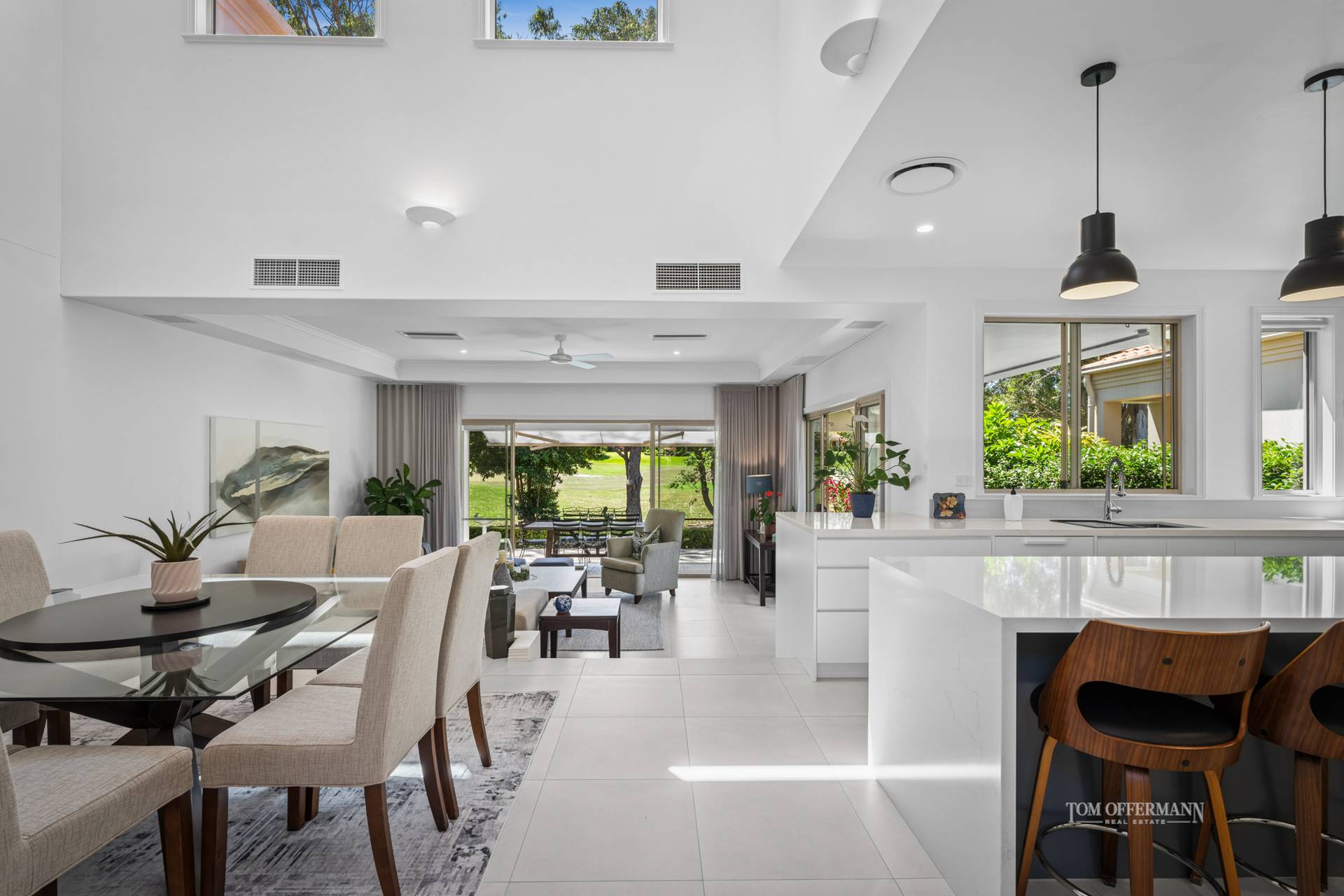 Built to an impeccable standard, the home radiates warmth and understated luxury. Soaring ceilings, generous glazing and natural cross-flow ventilation create an airy atmosphere, while the open-plan living space extends effortlessly to a large covered terrace designed for year-round entertaining.