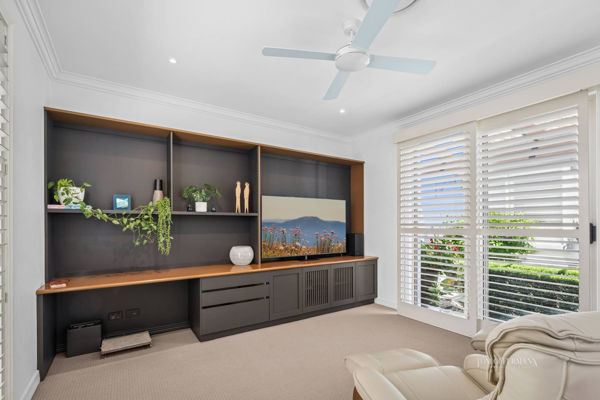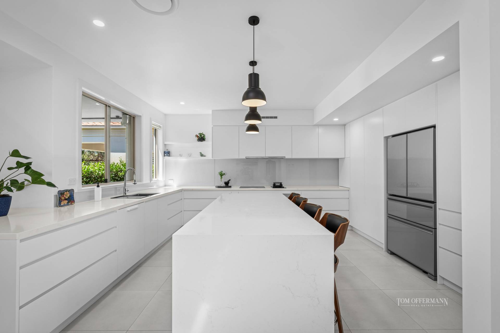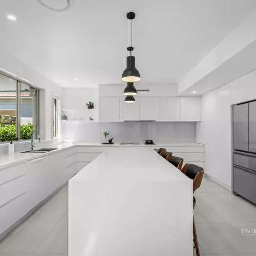The beautiful designer kitchen is both functional and refined, featuring thick Caesarstone benchtops, an oversized island breakfast bar, and a full suite of premium Miele appliances including dual ovens, induction and wok burners, plate warmer and dishwasher. Every detail reflects considered craftsmanship and relaxed elegance.