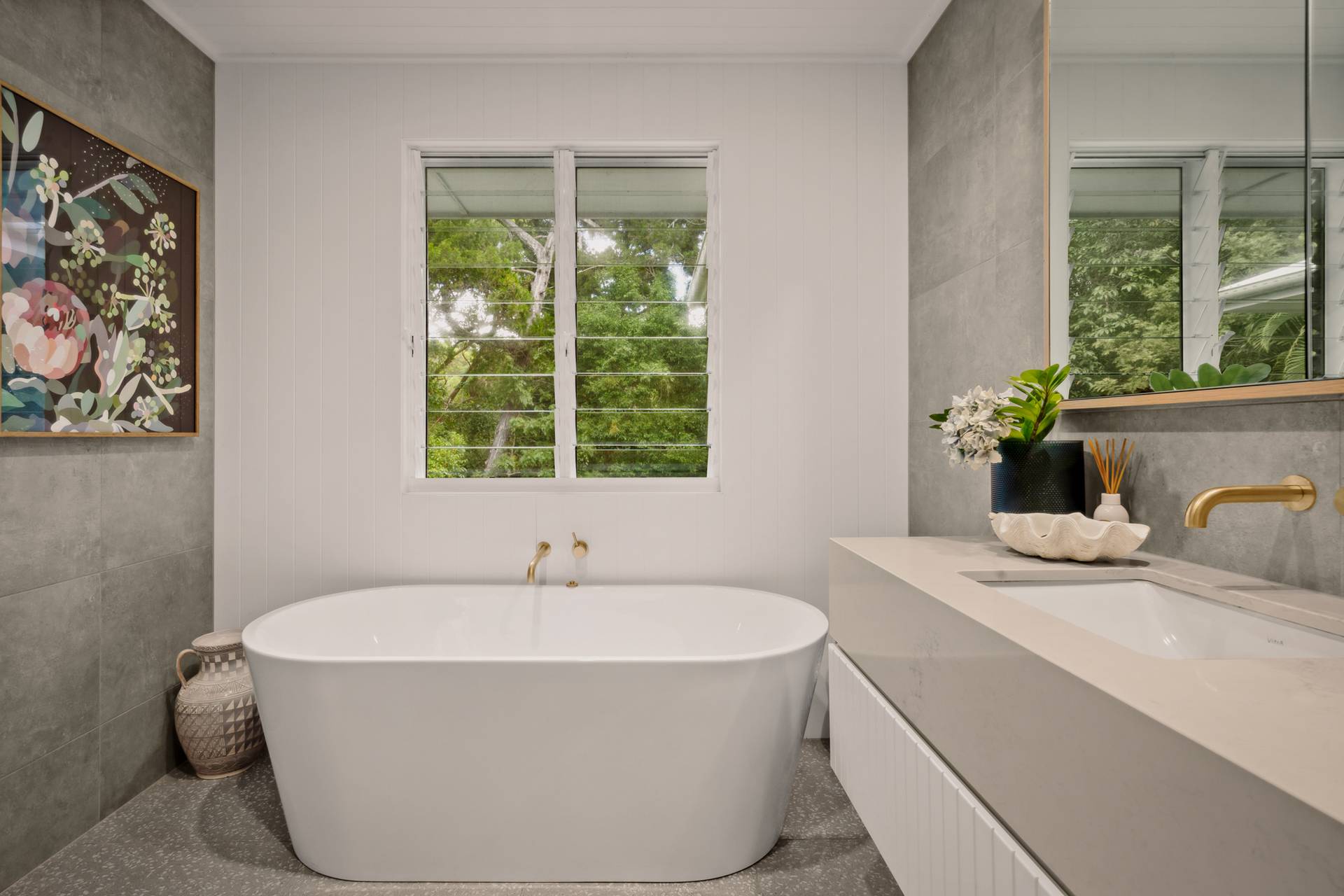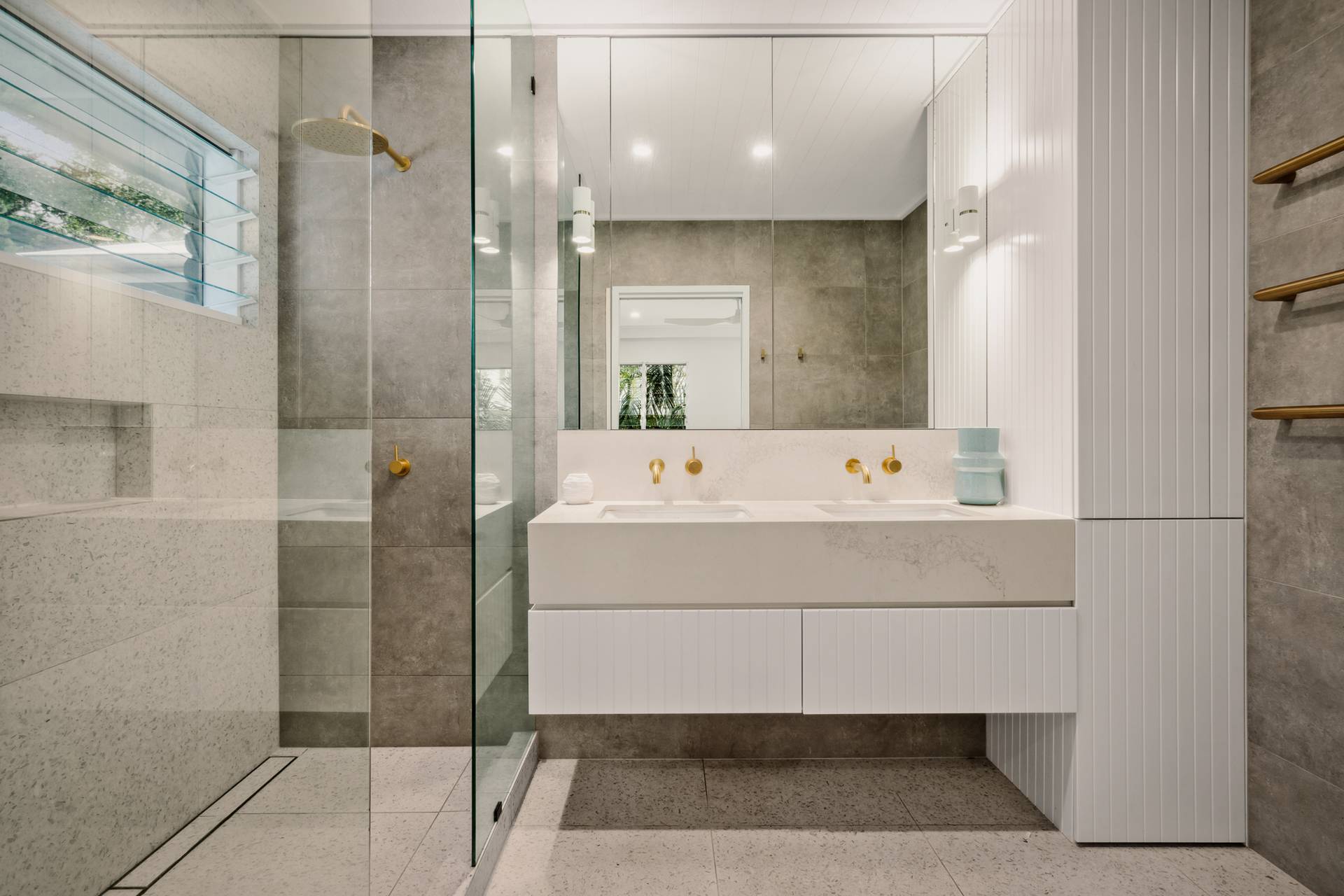 Louvres, sliding stacker timber doors, linen curtains and blinds