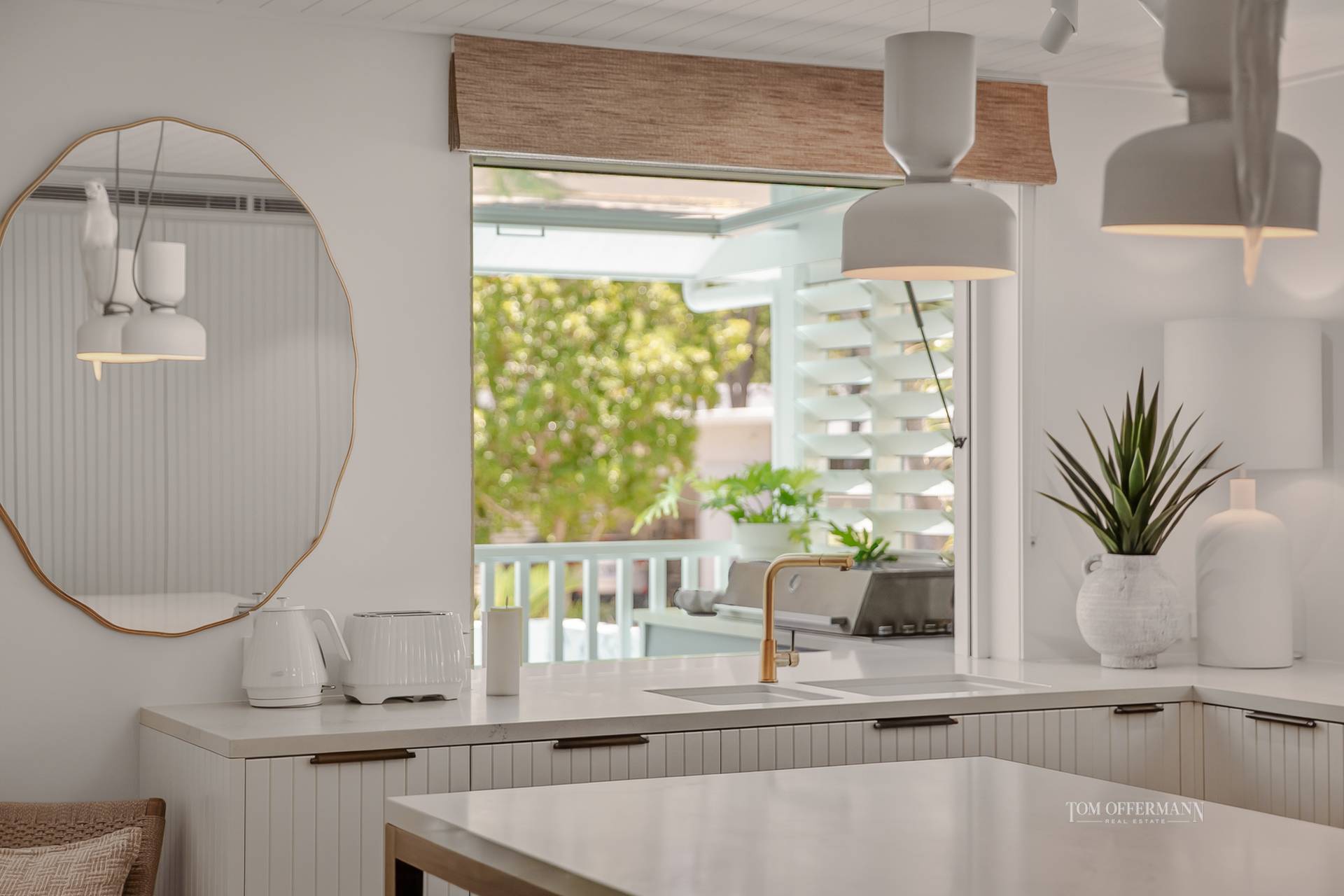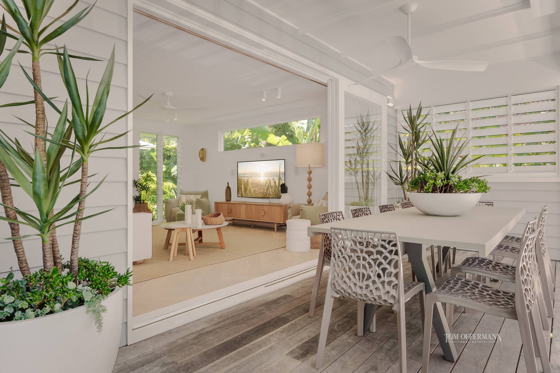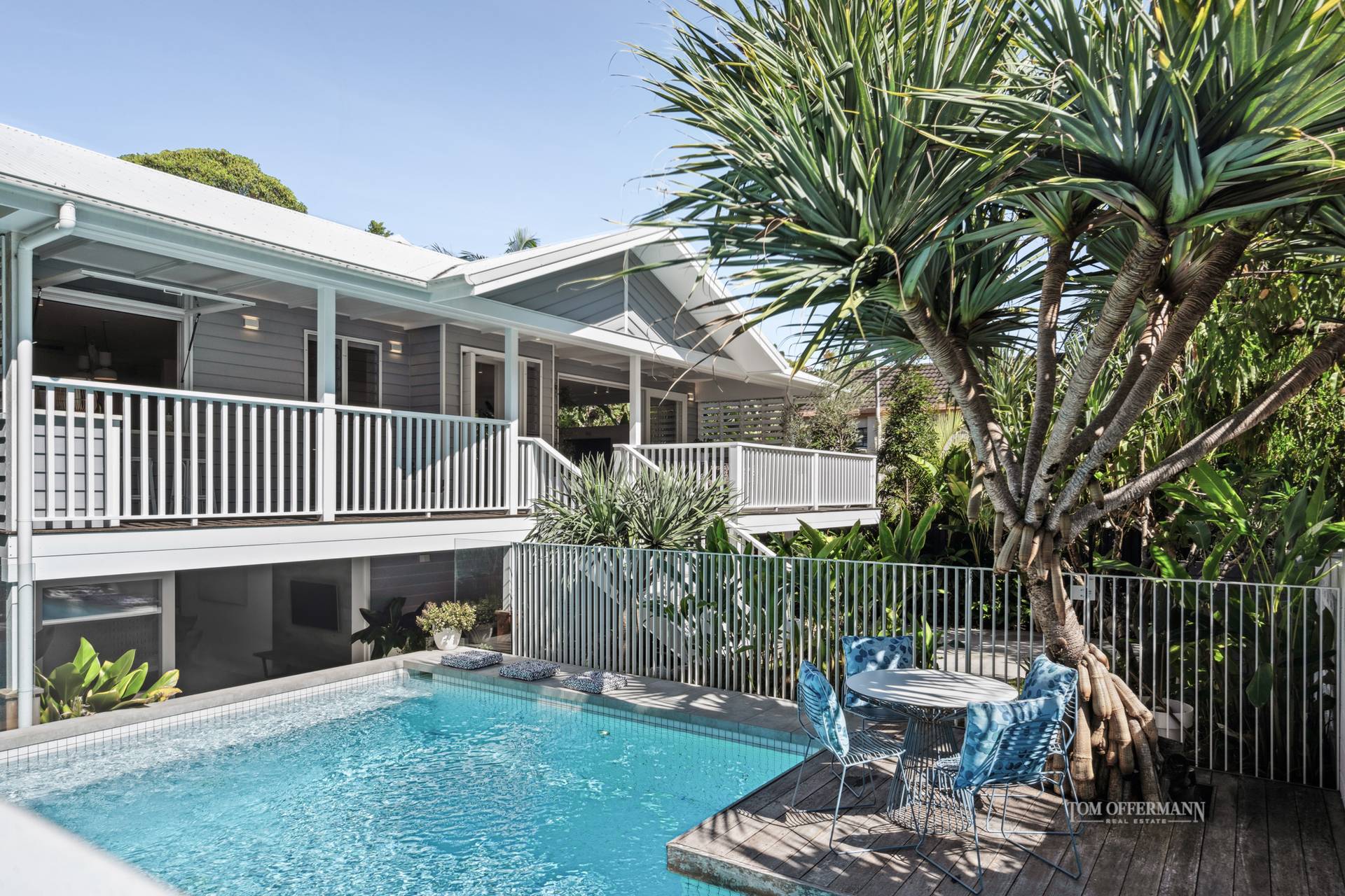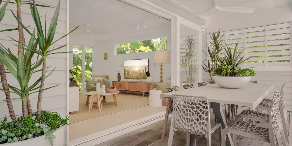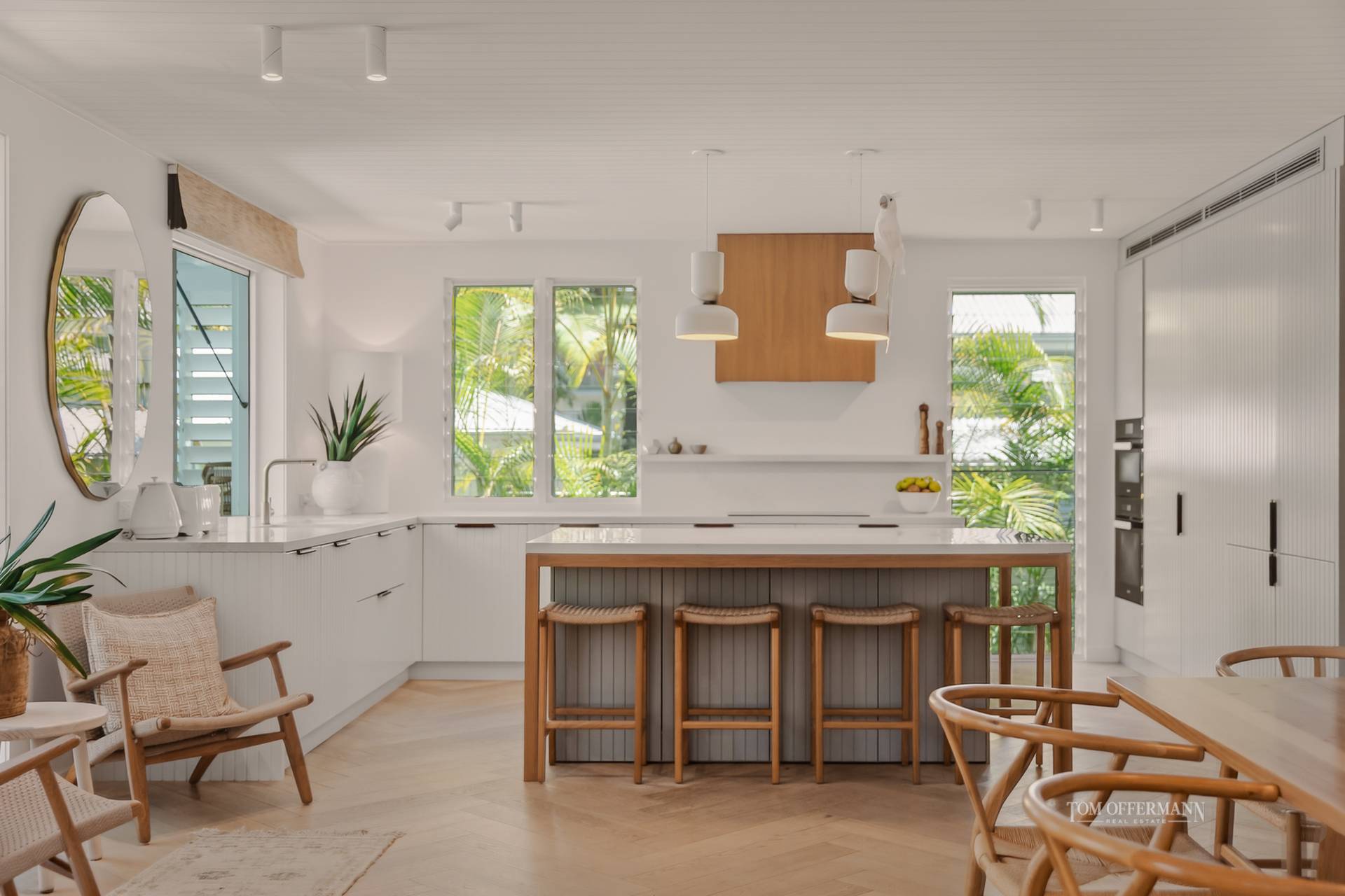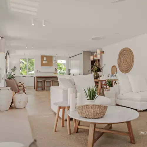 Beyond the Palm Springs-inspired entrance, you'll be welcomed by lush tropical gardens leading up to the stairs. As you step through the pivoting timber door, a world of refined luxury unfolds. This unique home or holiday house, known as 'Lola,' harmoniously blends contemporary Hamptons style with a touch of Queenslander charm and Scandinavian elegance. The design strikes a perfect balance between barefoot luxe and practicality, offering multiple spaces for gathering, entertaining, and creating lasting memories, while also providing private retreats for everyone.
