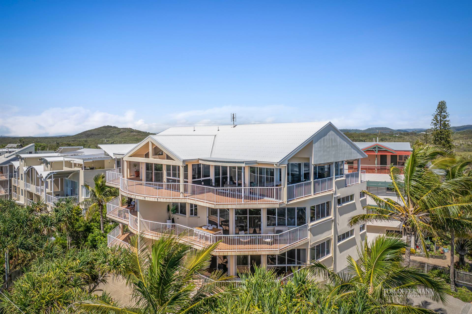 • Exterior: four-storey building on prime north-east facing corner block; built circa early 1990's; framed by mature established pandanus palms and coconut trees