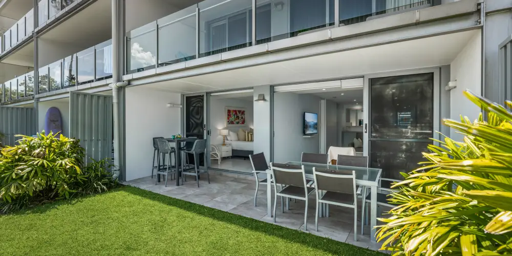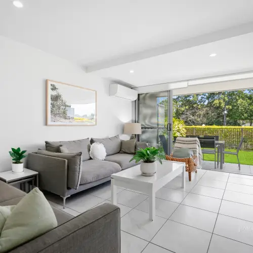 Blurring the line between the nucleus of the apartment is a lengthy undercover terrace with leisure furniture aplenty. It articulates the superlative ground floor position and is centre stage for entertaining, relaxing and sundowners.