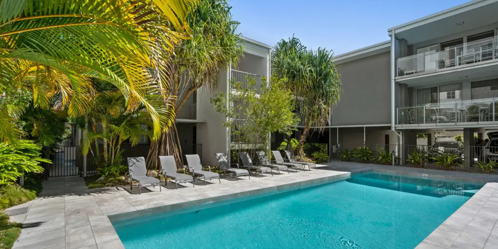 - Jacaranda Noosa Apartments: secure gated boutique complex of 15; on-site management; recent exterior facelift; landscaped gardens w pandanus & palms; 15m x 5m pool w sandy-tiled sun terrace, undercover BBQ area + sun lounges; 20m from #4 to jetty adjacent to Elysium Noosa Resort for Noosa Ferry, leisure craft etc