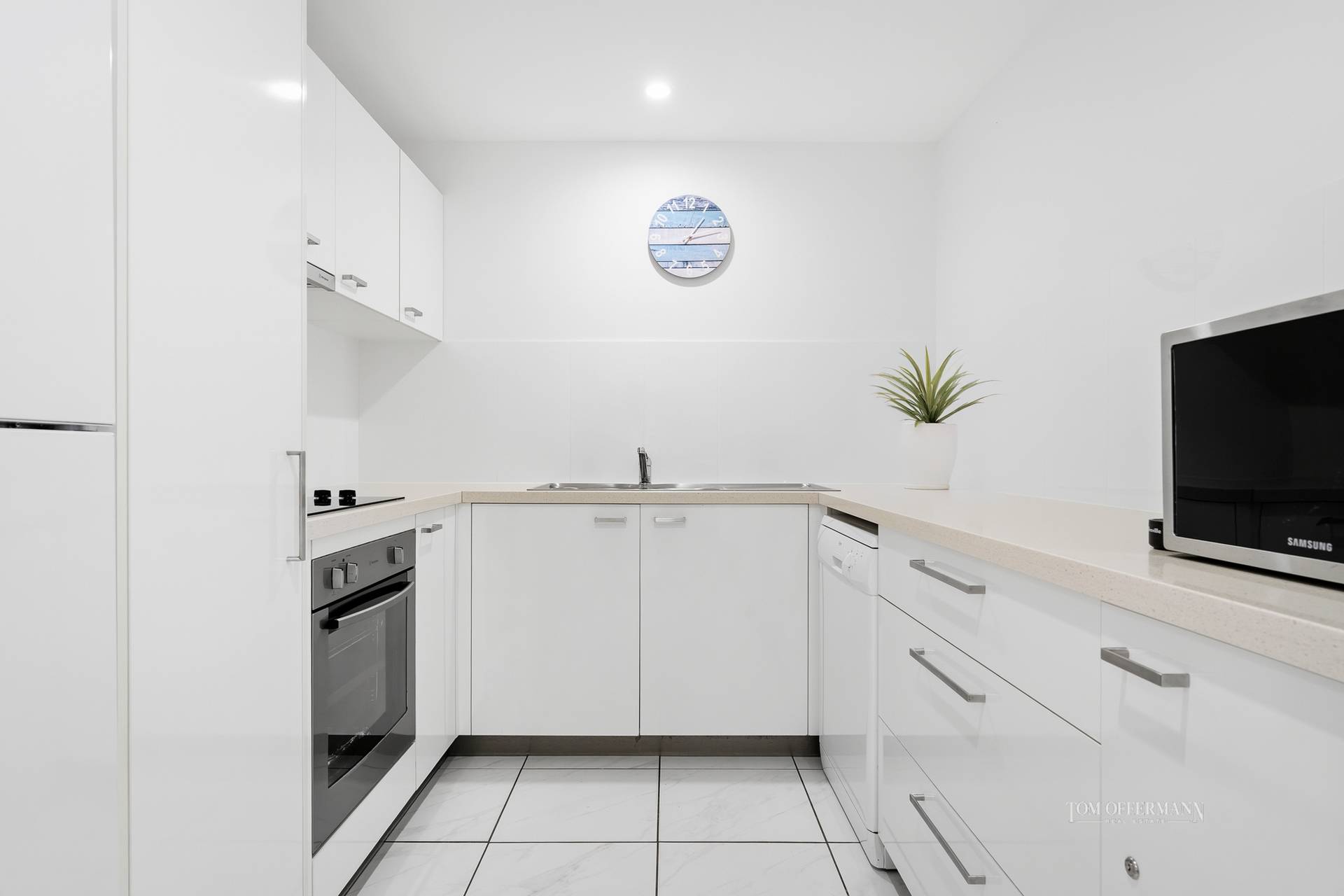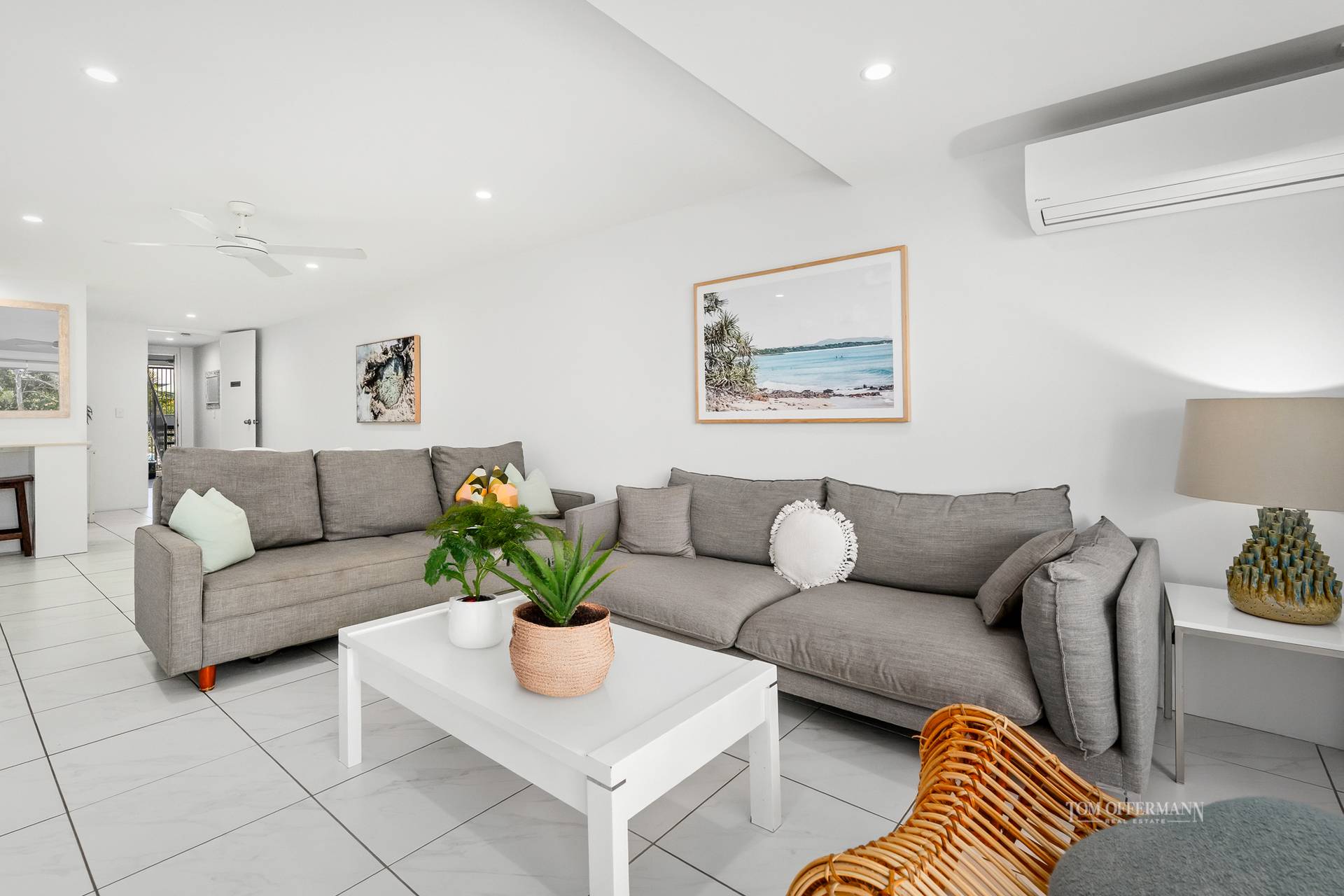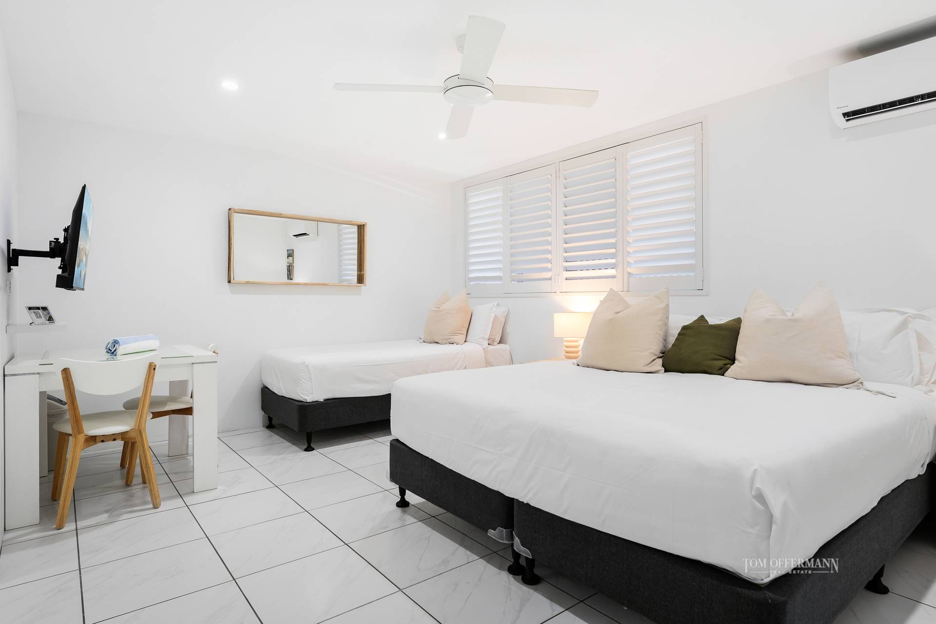 - About: 2 bed apartment or dual key option i.e. front door into entry w sep secure entries to 2 x 1-bdrm apartments; white bright & light interior incl marble effect floor tiles; monochromatic furniture & accessories; aircon/fans; colorful art; single car space w dedicated storage