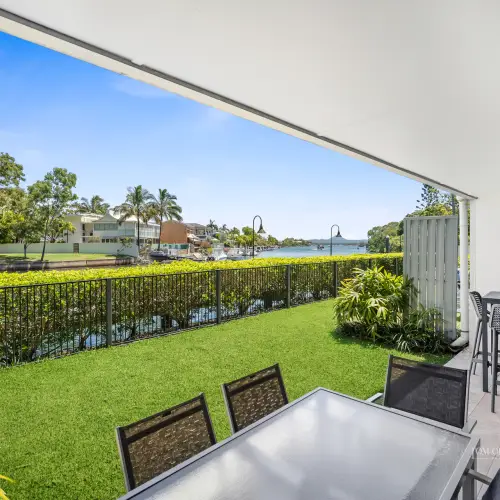 - Terrace: ground floor 19m x 6.5m undercover w leisure furniture incl dining table; abuts lush lawn & riverside walkway; close to jetty at Elysium