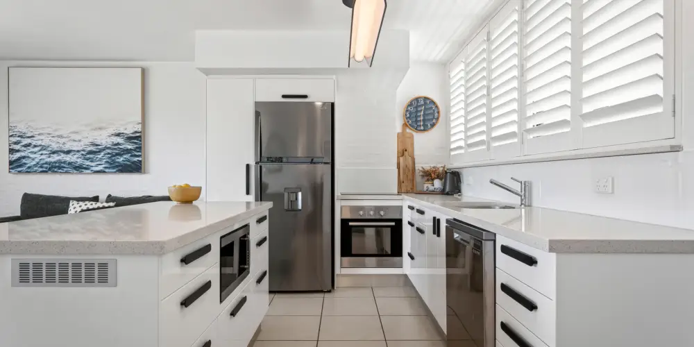 • Kitchen: SS microwave, oven + cooktop, dishwasher, refrigerator, stone-topped benches, 2-pac cabinetry