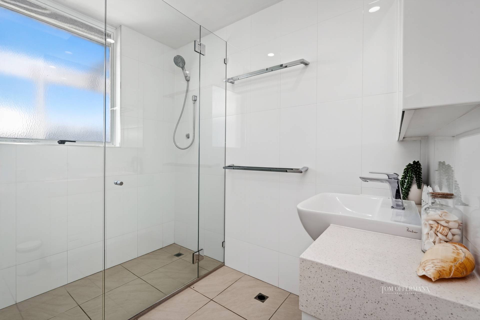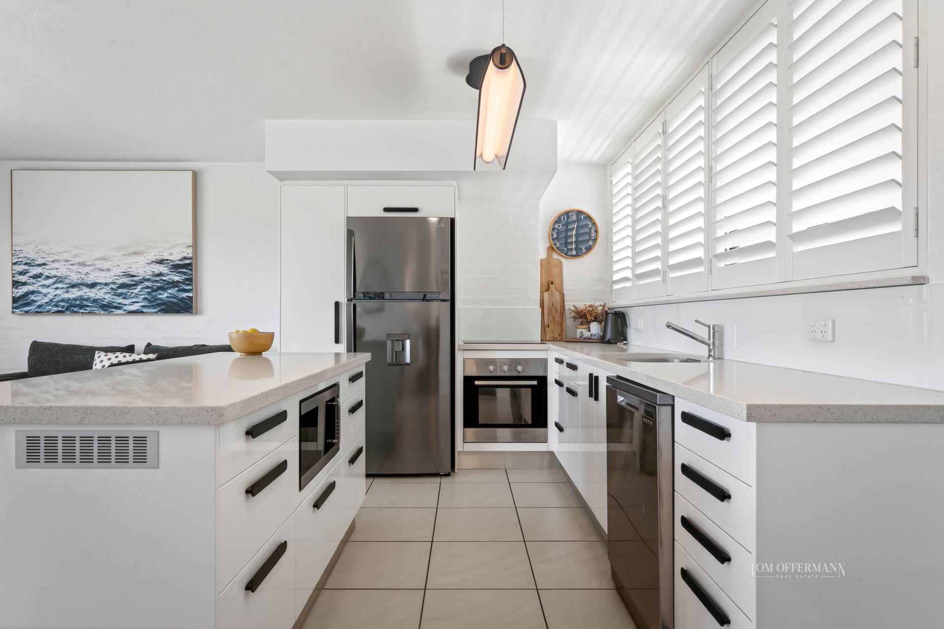 Open the door to a touch of coastal class and be drawn immediately past the substantial open-plan dining and living spaces, which flow seamlessly to a north-easterly covered balcony and present with a beachy neutral-hued interior. It is obviously perfect for long lunches, as an alternative to frequenting the nearby nationally recognised restaurants, or just casual sundowners with friends. After-all the contemporary kitchen with stone-topped island and breakfast bar, 2-pac cabinetry plus whizz-bang appliances, has everything needed for entertaining.