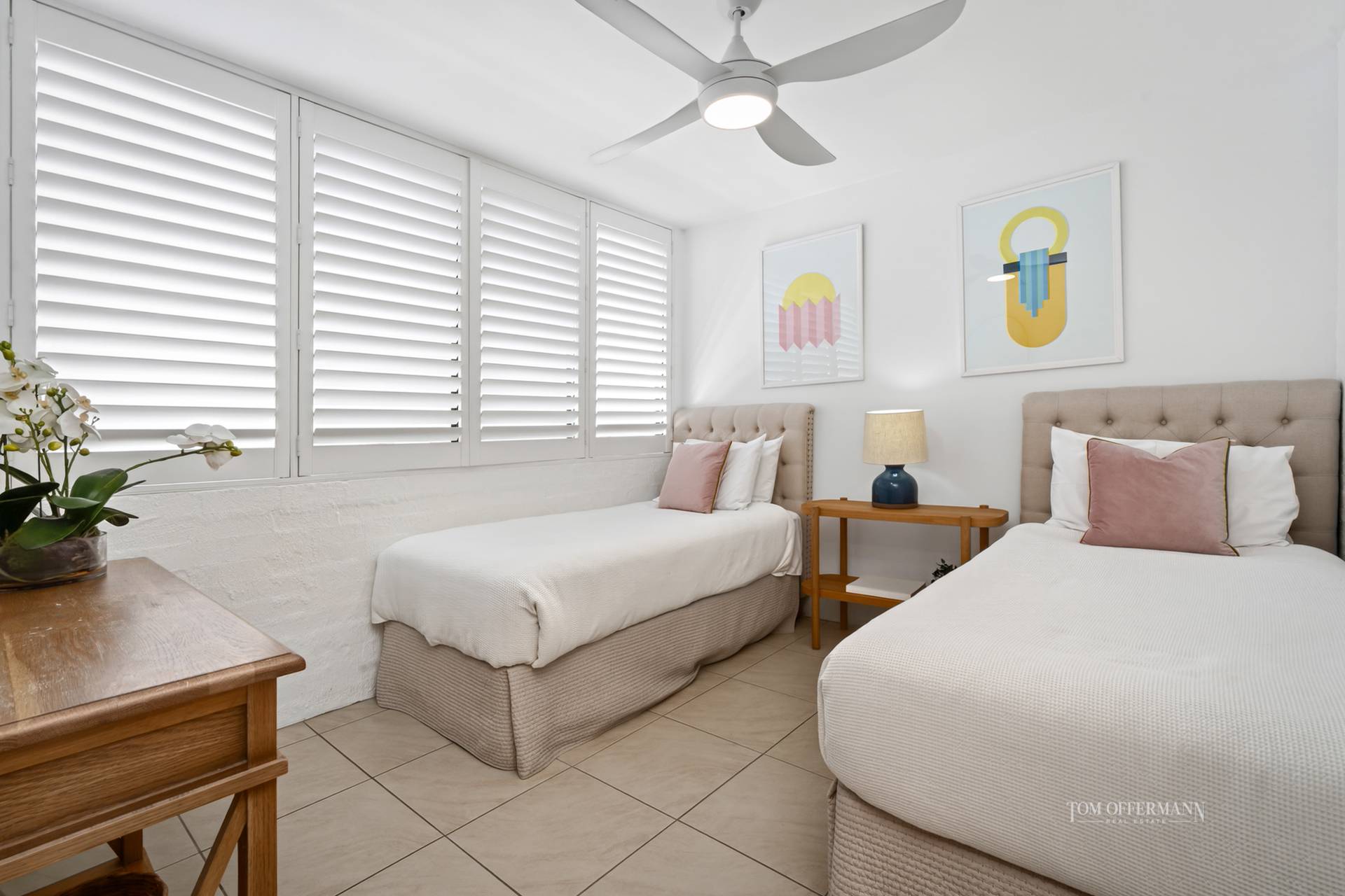 To the left off the hallway, along from the master suite is a queen size bedroom. Eyes are immediately drawn to the leafy park with white sand frontage to the sparkling lagoon, bobbing anchored boats of varying sizes, also views out to the Noosa River and beyond. Abutting the second bedroom is a third, plus a bathroom. There is also a separate toilet and a generous hideaway laundry.