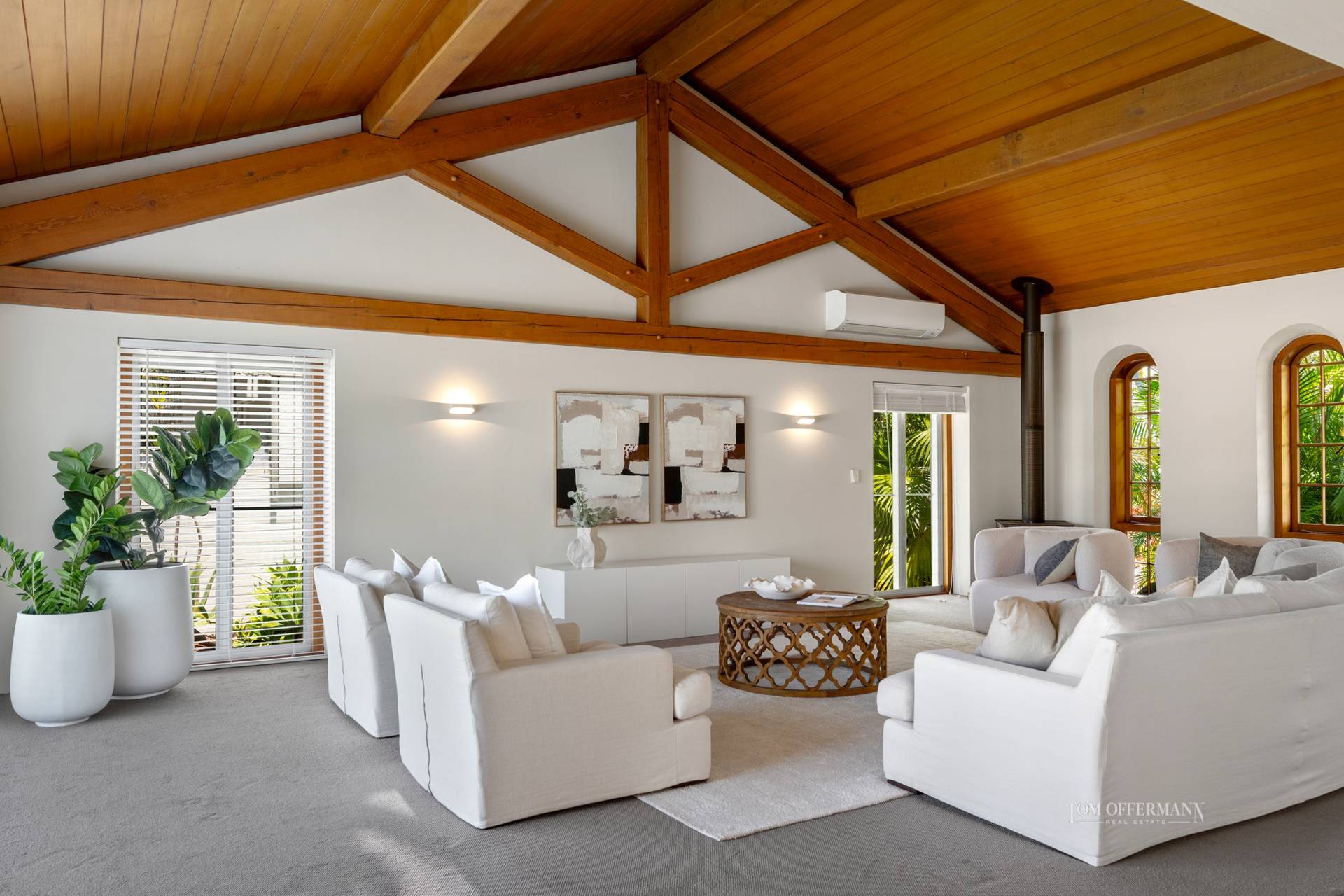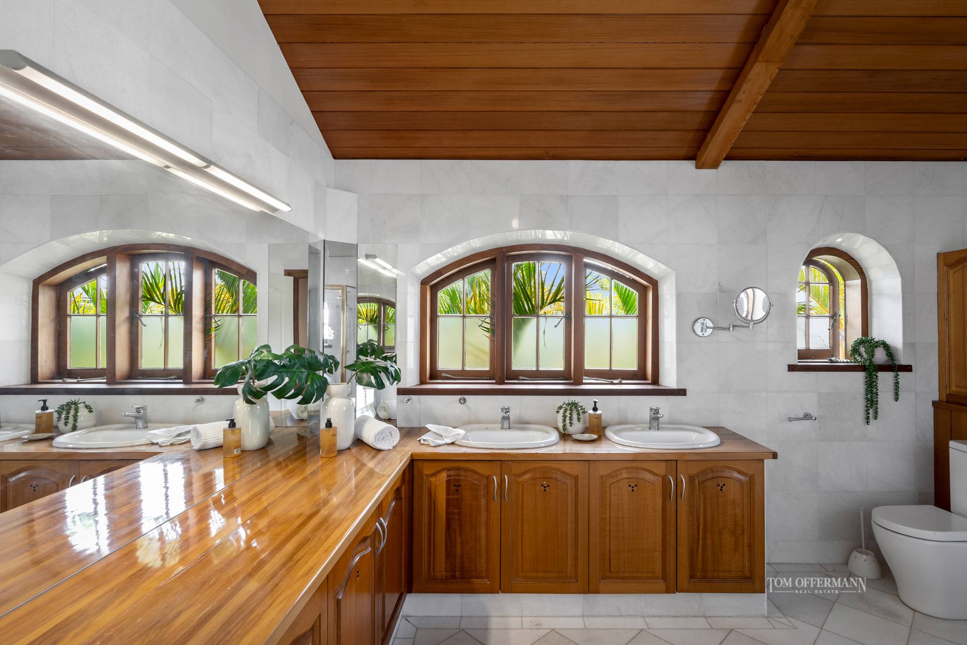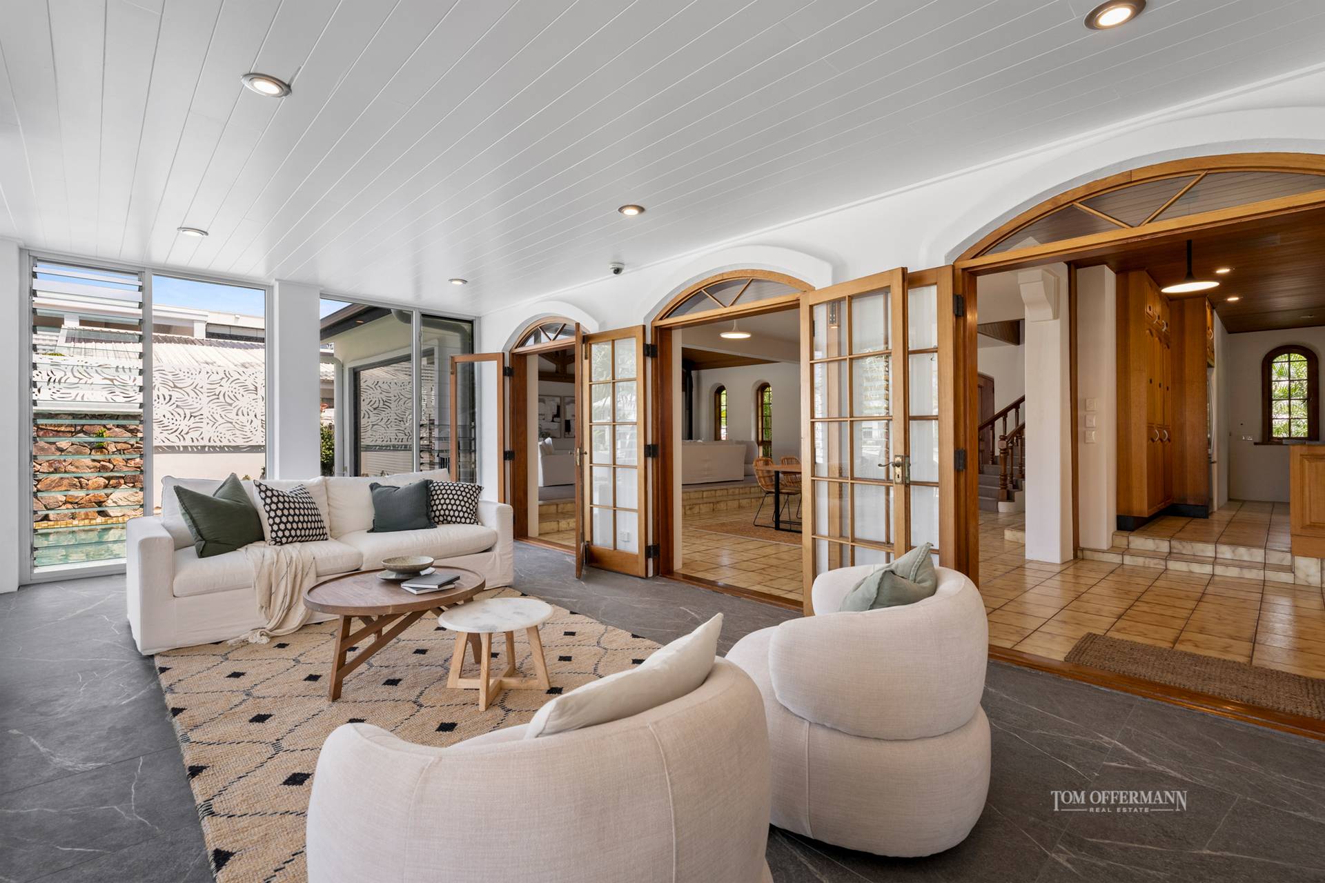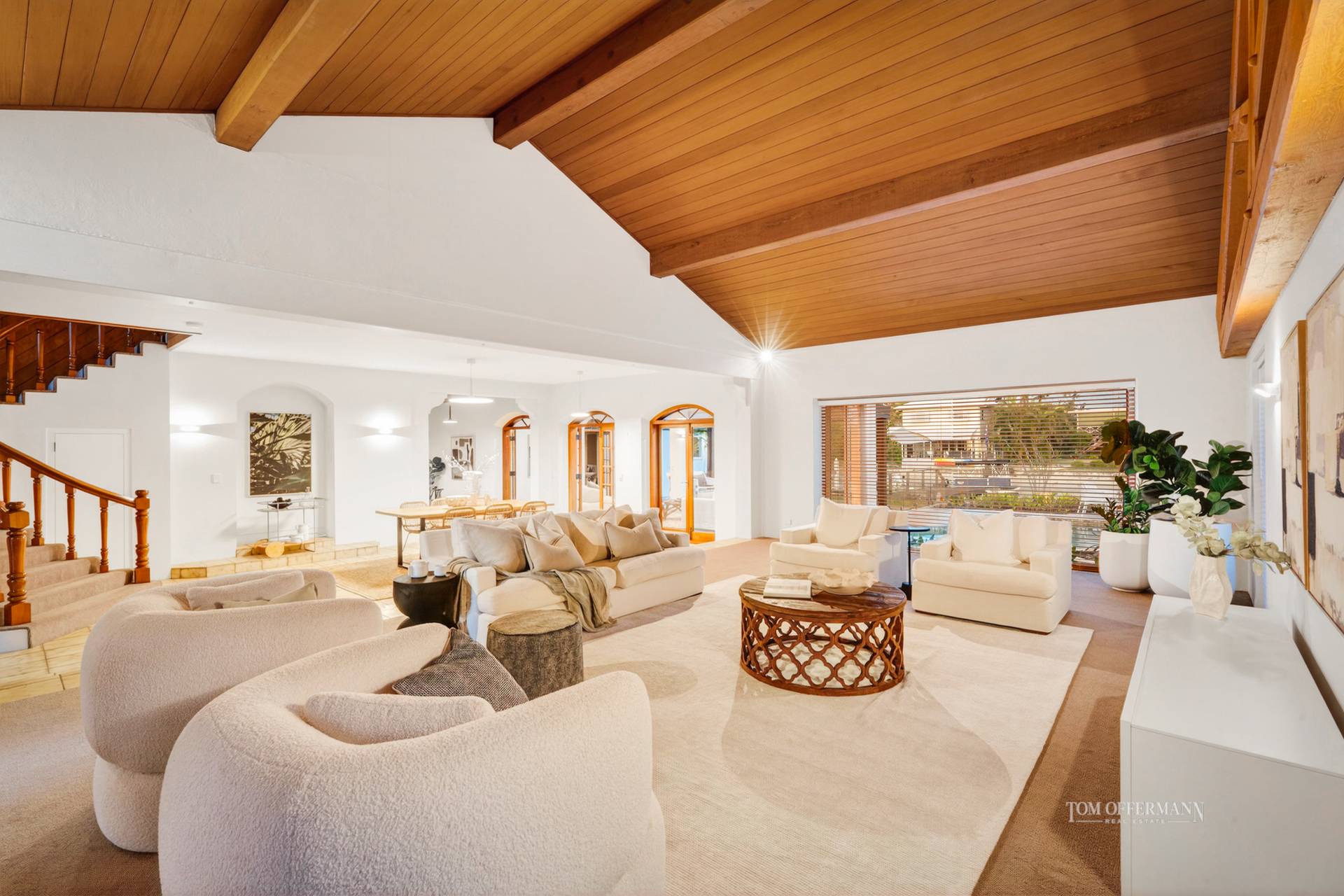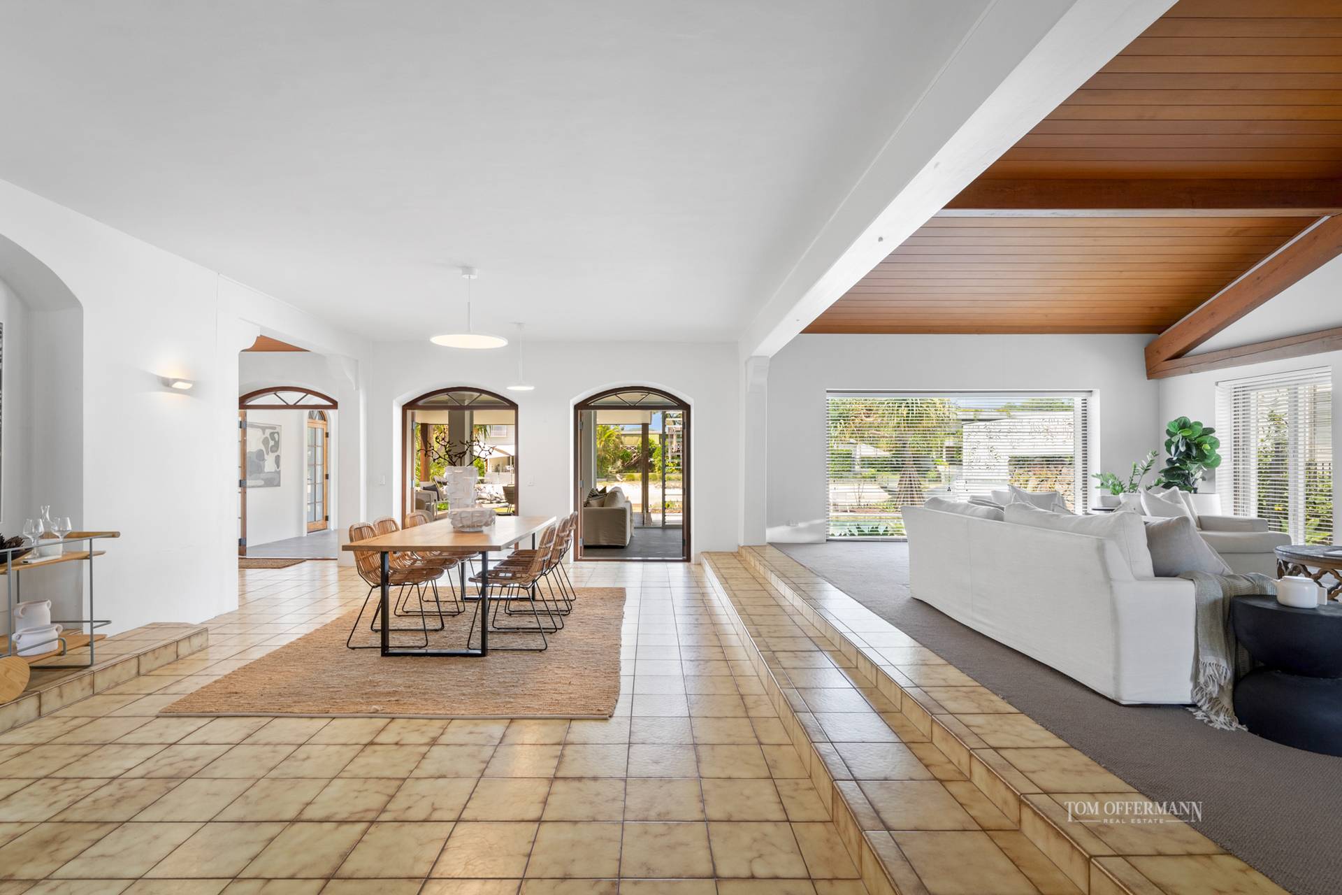 Admire lofty clerestory ceilings, also banks of arch-topped windows and doors, which seemingly attract abundant bright light to saturate the massive predominantly neutral toned, open-plan living spaces.