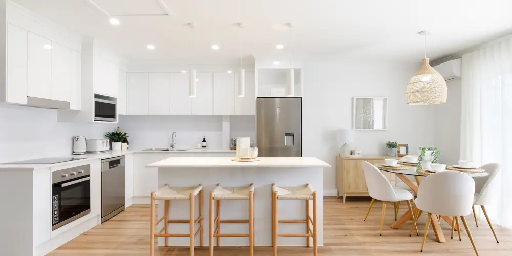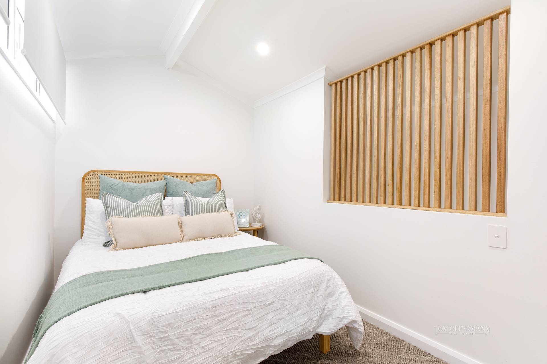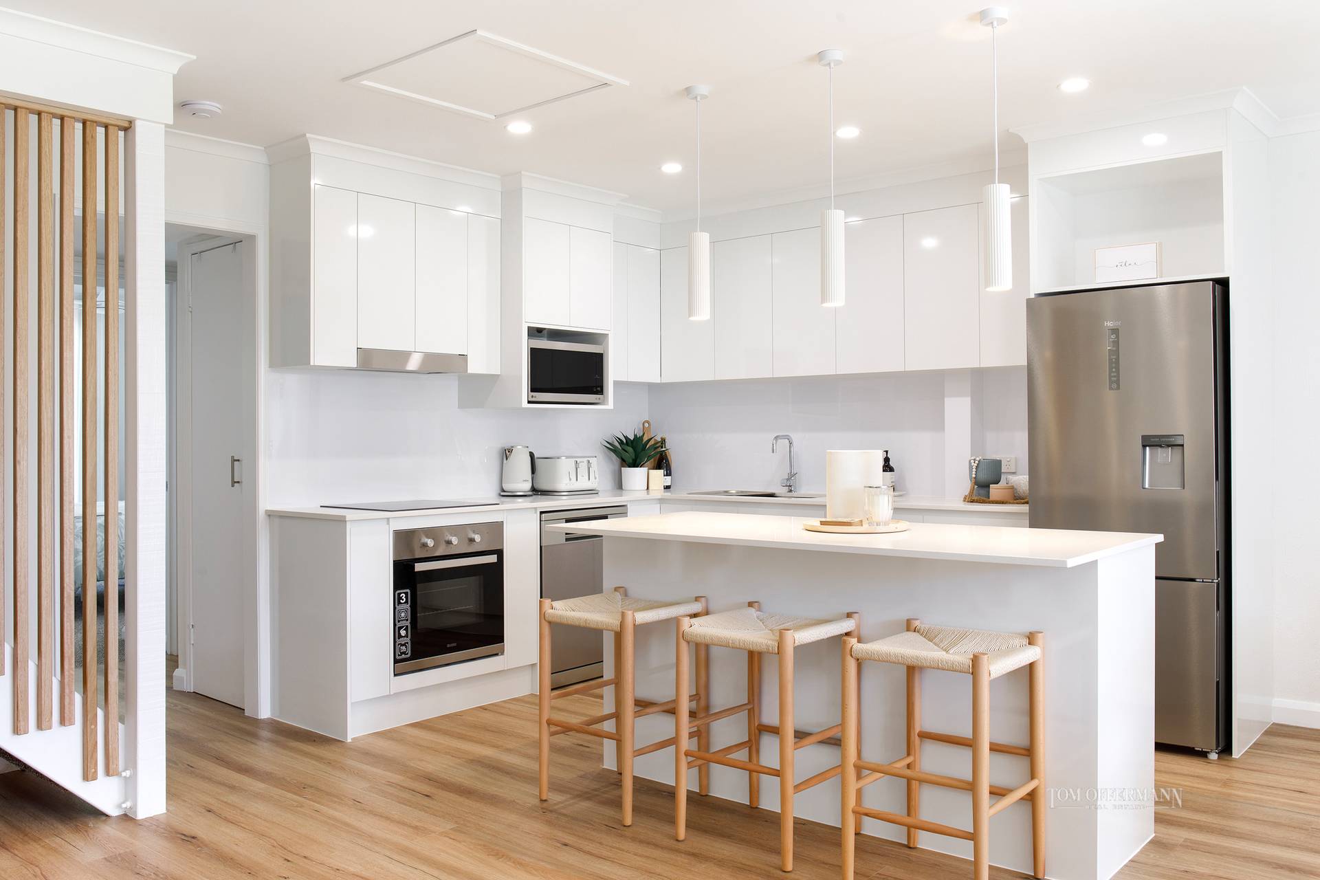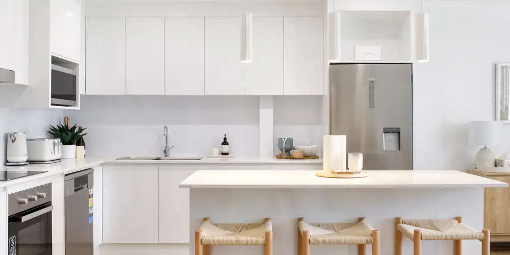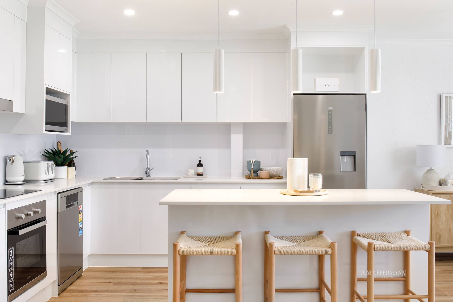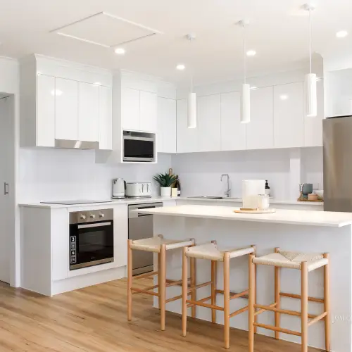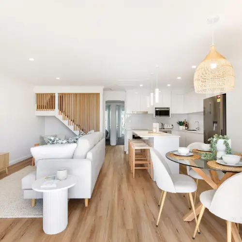 The sleeping quarters continue the coastal aesthetic, soft, fresh and inviting. They extend to a private terrace overlooking the tranquil Weyba Creek Conservation Reserve. Above, a versatile loft offers flexibility as a third bedroom, study or children’s retreat. At the heart of the home, the light-filled contemporary kitchen impresses with stone benchtops, a breakfast bar, sleek 2-pac cabinetry and premium appliances - perfectly suited to entertaining or intimate dinners at home.