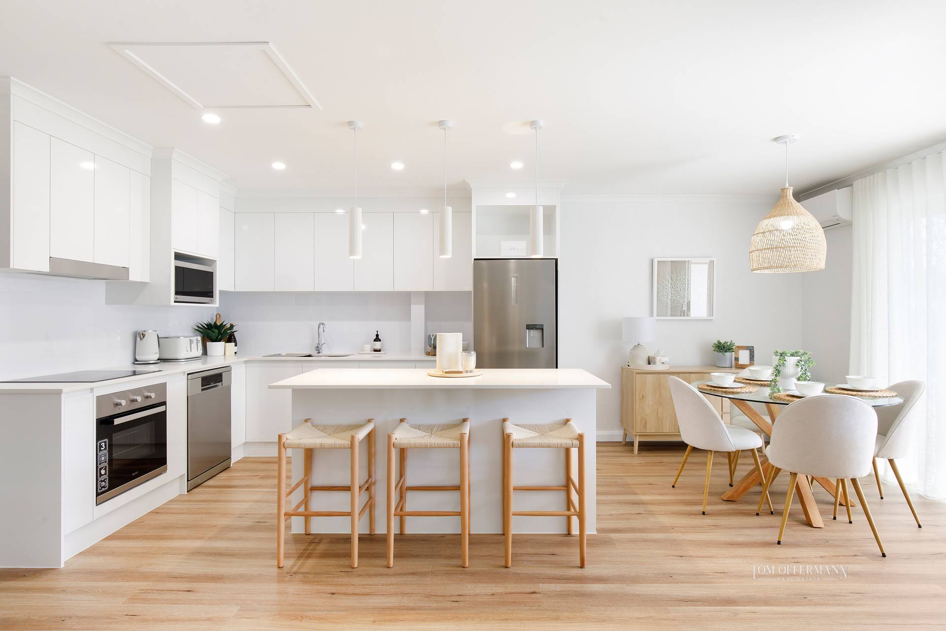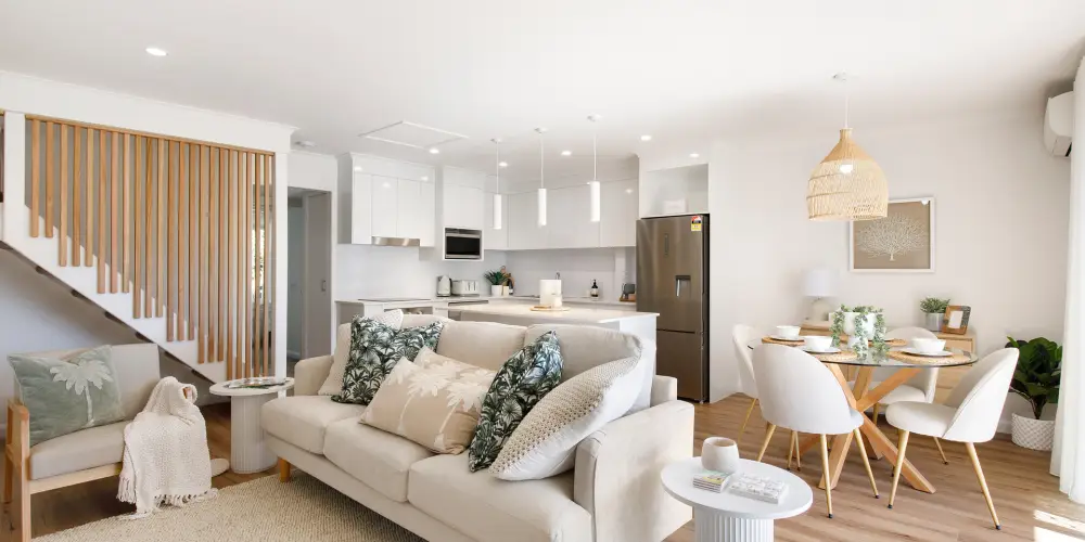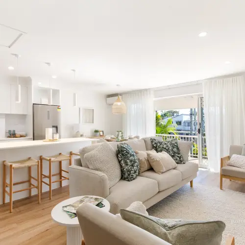 Step inside and discover a serene coastal haven where a sophisticated renovation meets relaxed beachside style. Wispy sheers drift gently in the breeze, a glass-topped dining table is paired with sculptural white bucket chairs, light timber accents add warmth, and sumptuous neutral sofas are layered with palm-inspired textures. The ambience is uplifting and refined, while the clever open-plan design embraces climate and connection to the outdoors - delivering an effortless, year-round holiday lifestyle.