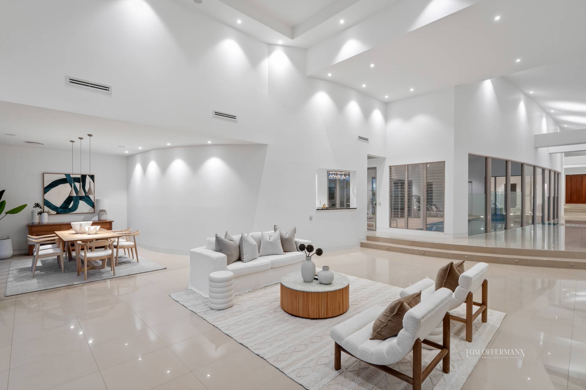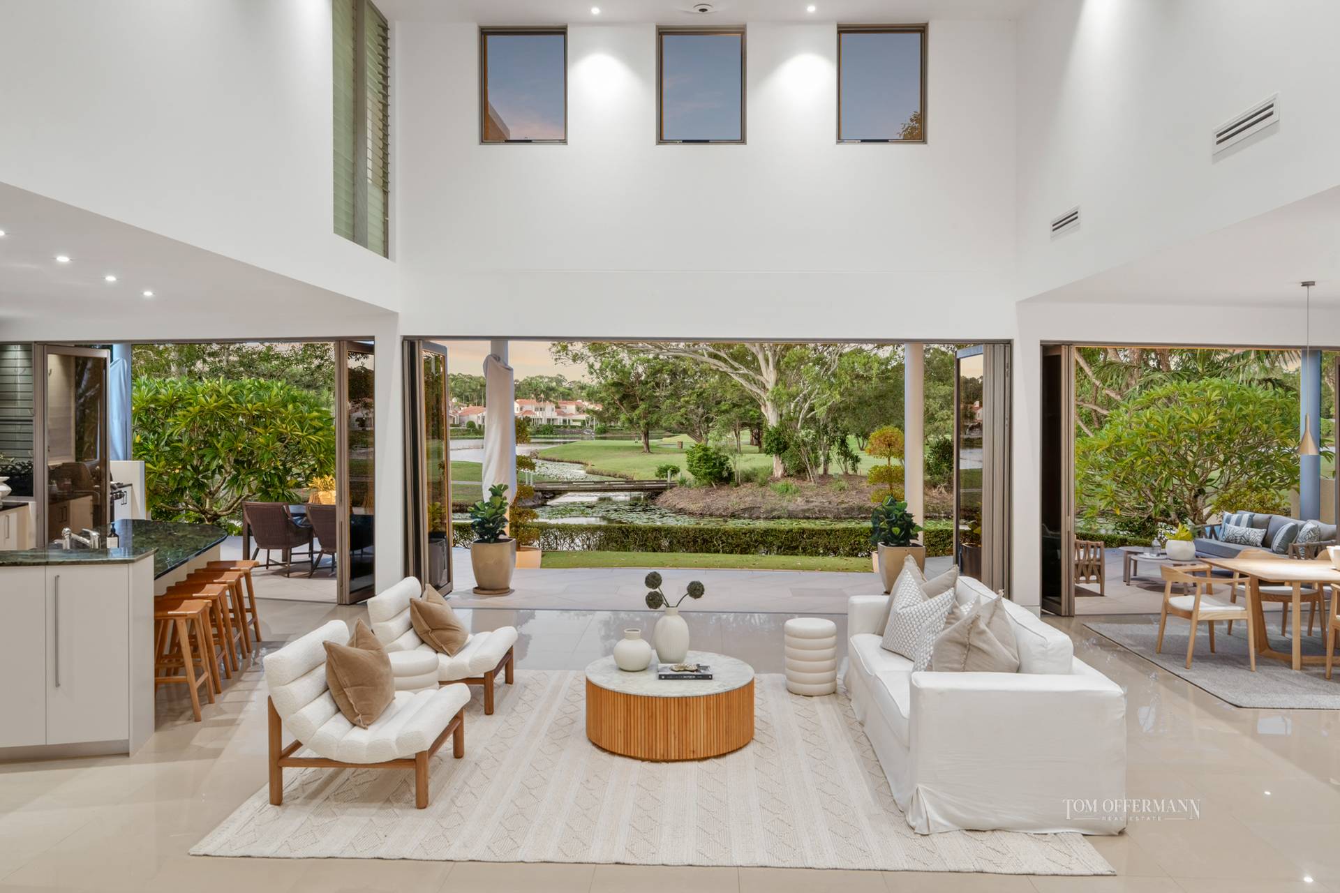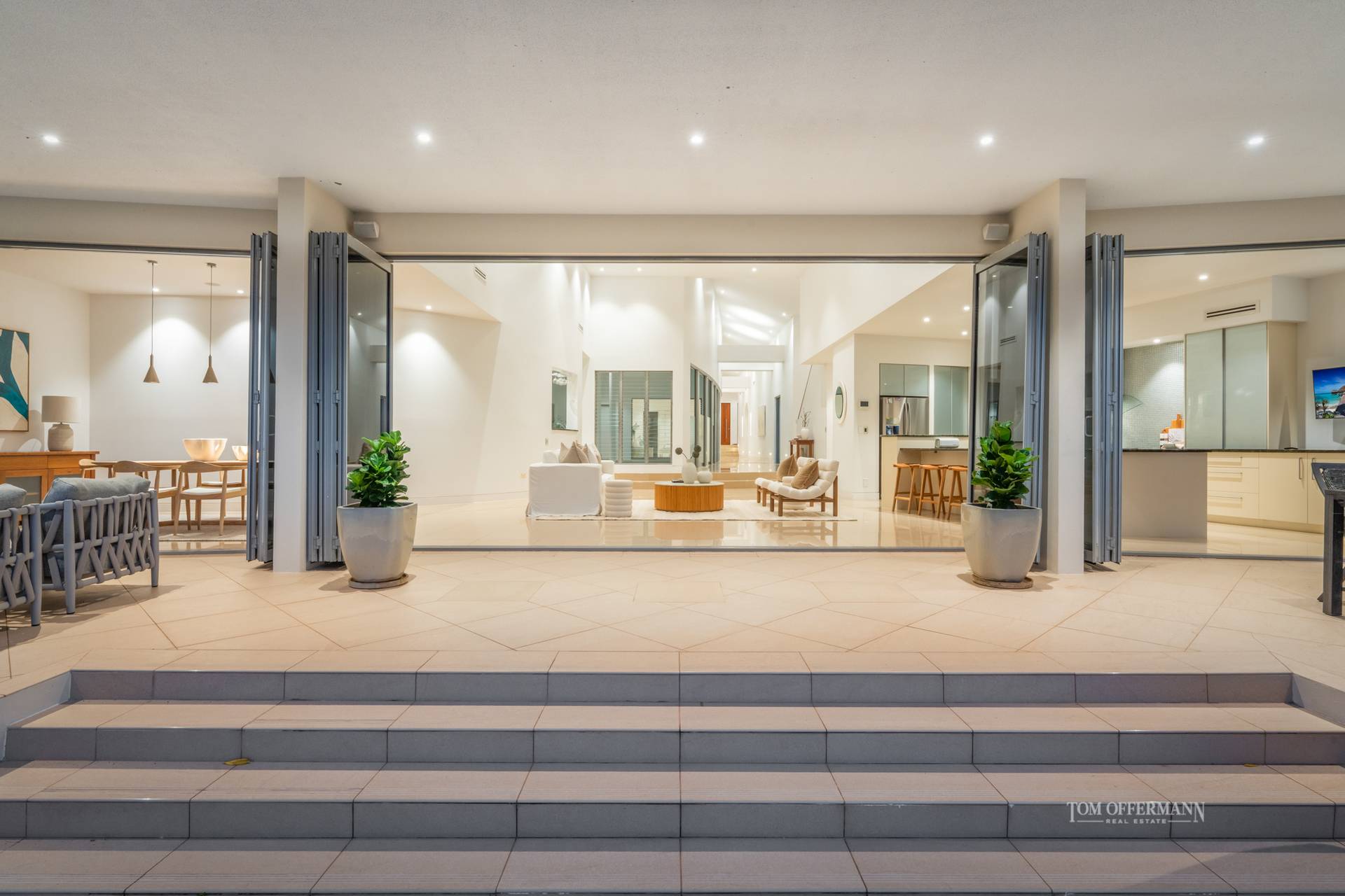 And note how indoors coalesces naturally with the outdoors. Thanks to a lofty clerestory ceiling void and the lengthy north-facing disappearing doors of the wide undercover terraces, both the width of the substantial residence, dappled natural light invites itself in, to shadow dance over endless travertine.