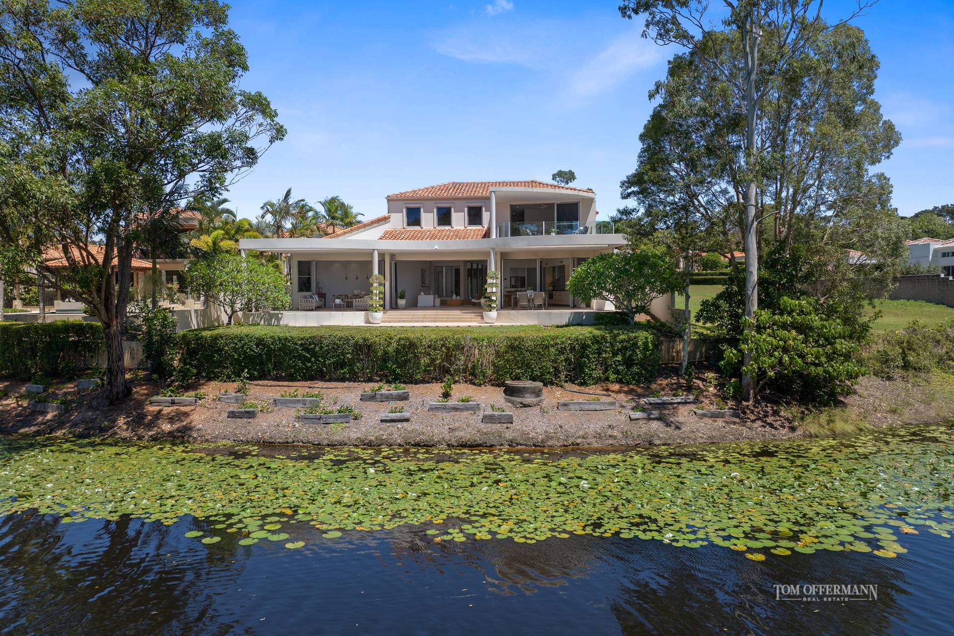 • Exterior: north side terraces w lawn fridged by hedges to lily-covered lake; 'island' w ducks & bird attracting trees & beyond is 17th tee; solar system 6.6kW/16 x 390 w JA solar panels & 5kw SMA; 17 solar panels; water tank 1500L; feature white stone garden art; hedges, tropical magnolias, frangipani, gardenias
