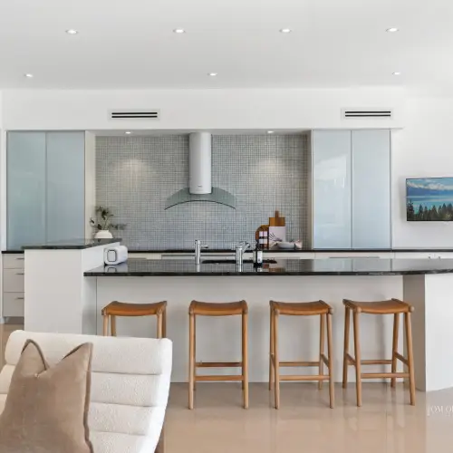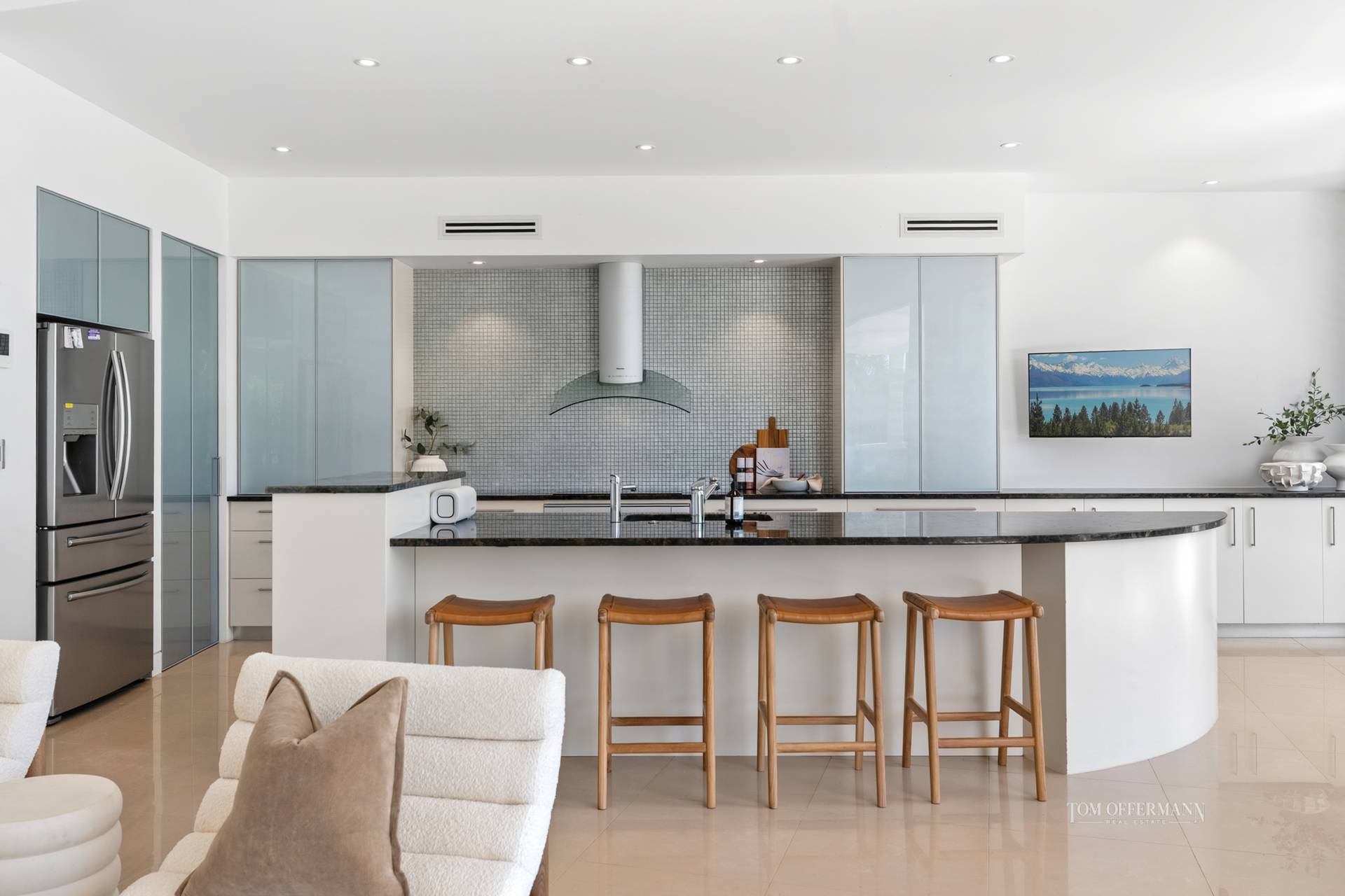 • Kitchen: galley style w black granite topped cream soft-close cabinetry incl 4m island w curved breakfast bar; sizeable WIP; Miele 1200 oven & cooktop, micro/convec oven + integrated dishwasher; Samsung 4-door icemaker fridge; Zip Hydro tap; TV; outdoor kitchen w Weber BBQ & fridge