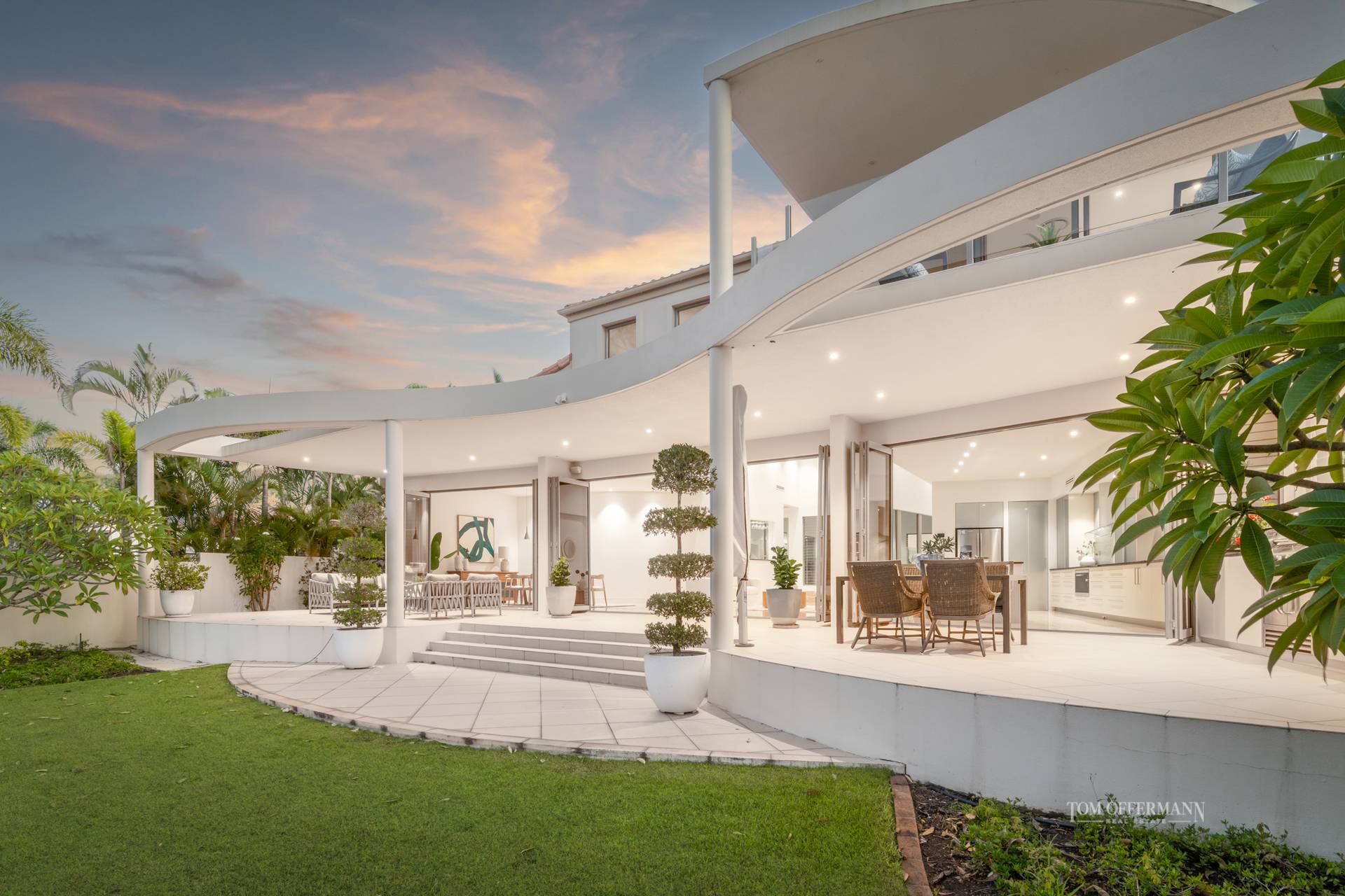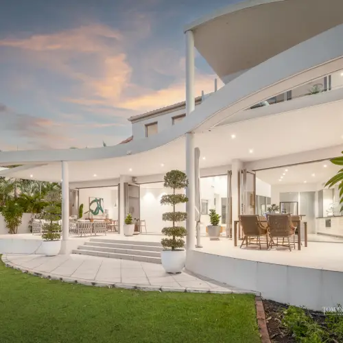 Admire the manicured garden, shiny leafed tropical magnolias, evergreen frangipani, gardenia hedges, gracious foxtail palms, extra roomy driveway, and entry with statement timber pivot door.