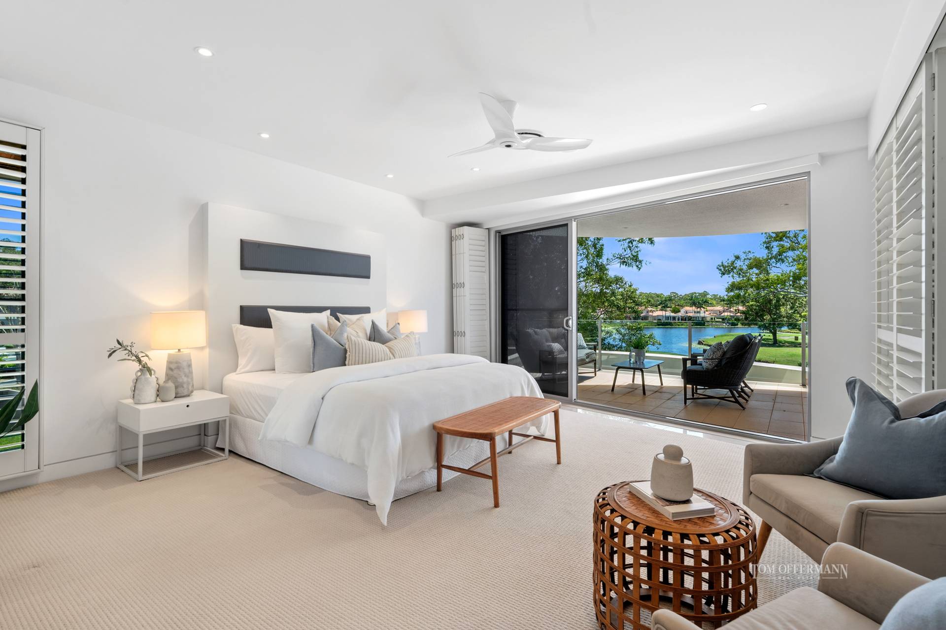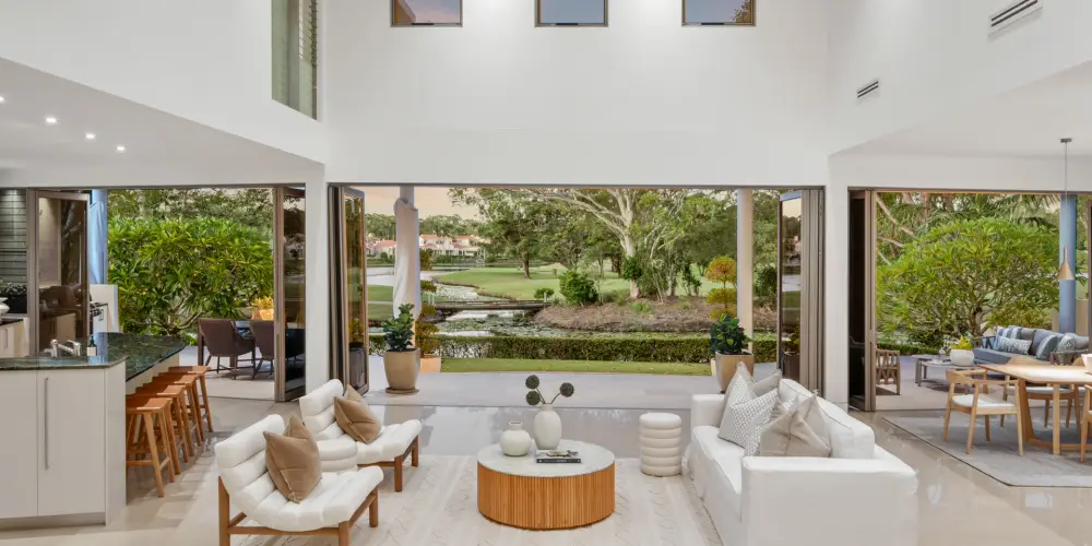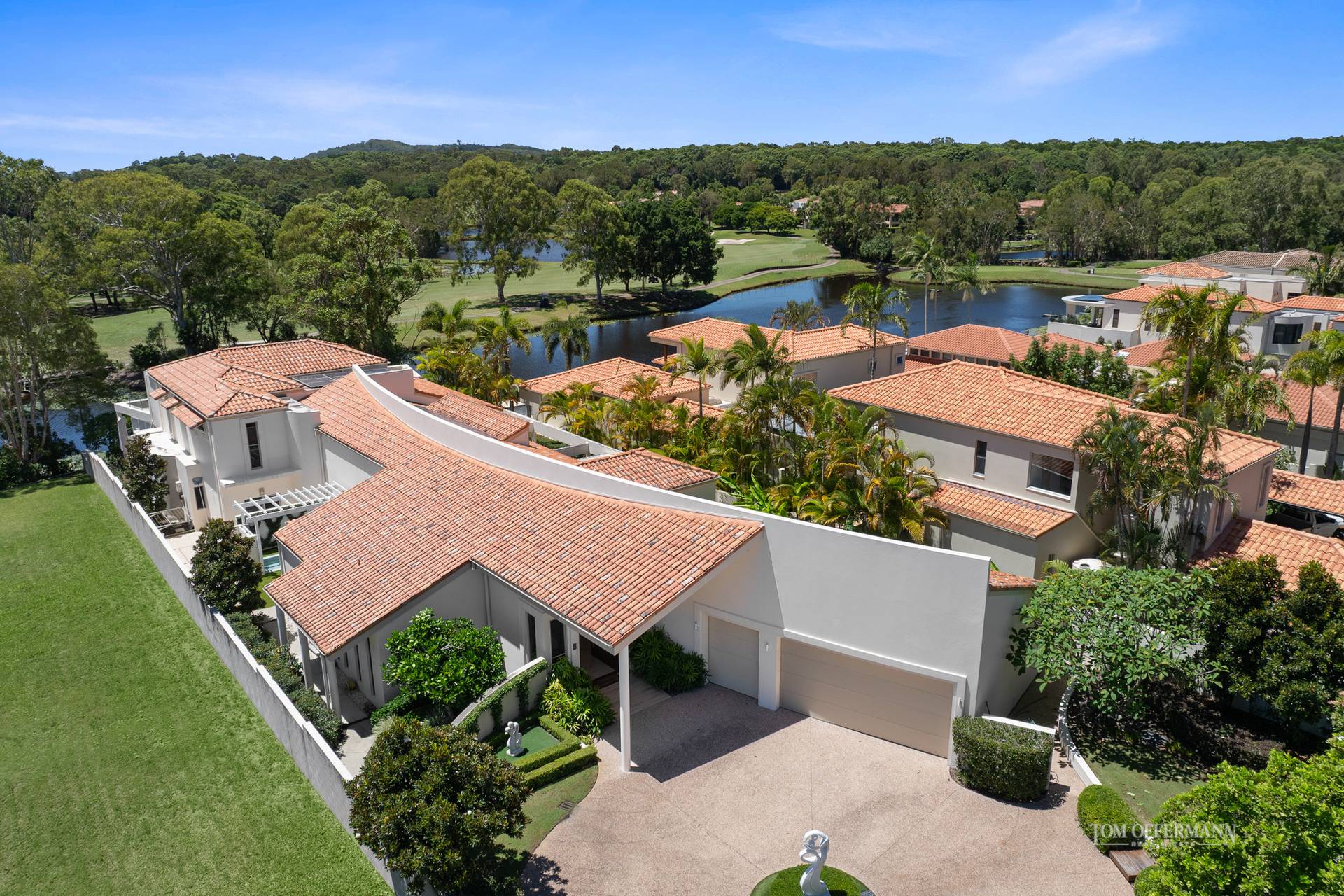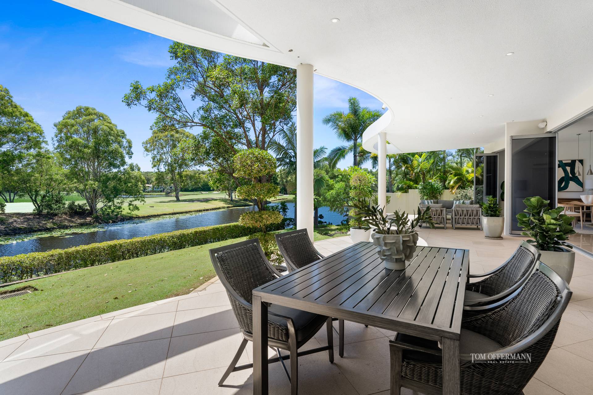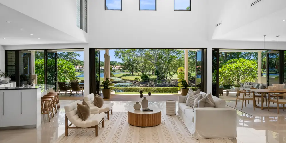 The alfresco terraces also ostensibly hover over the lily-padded lake and 'island' with native bird attracting trees, separating the residence from the 17th fairway and beyond to wide views of the lush internationally rated course.