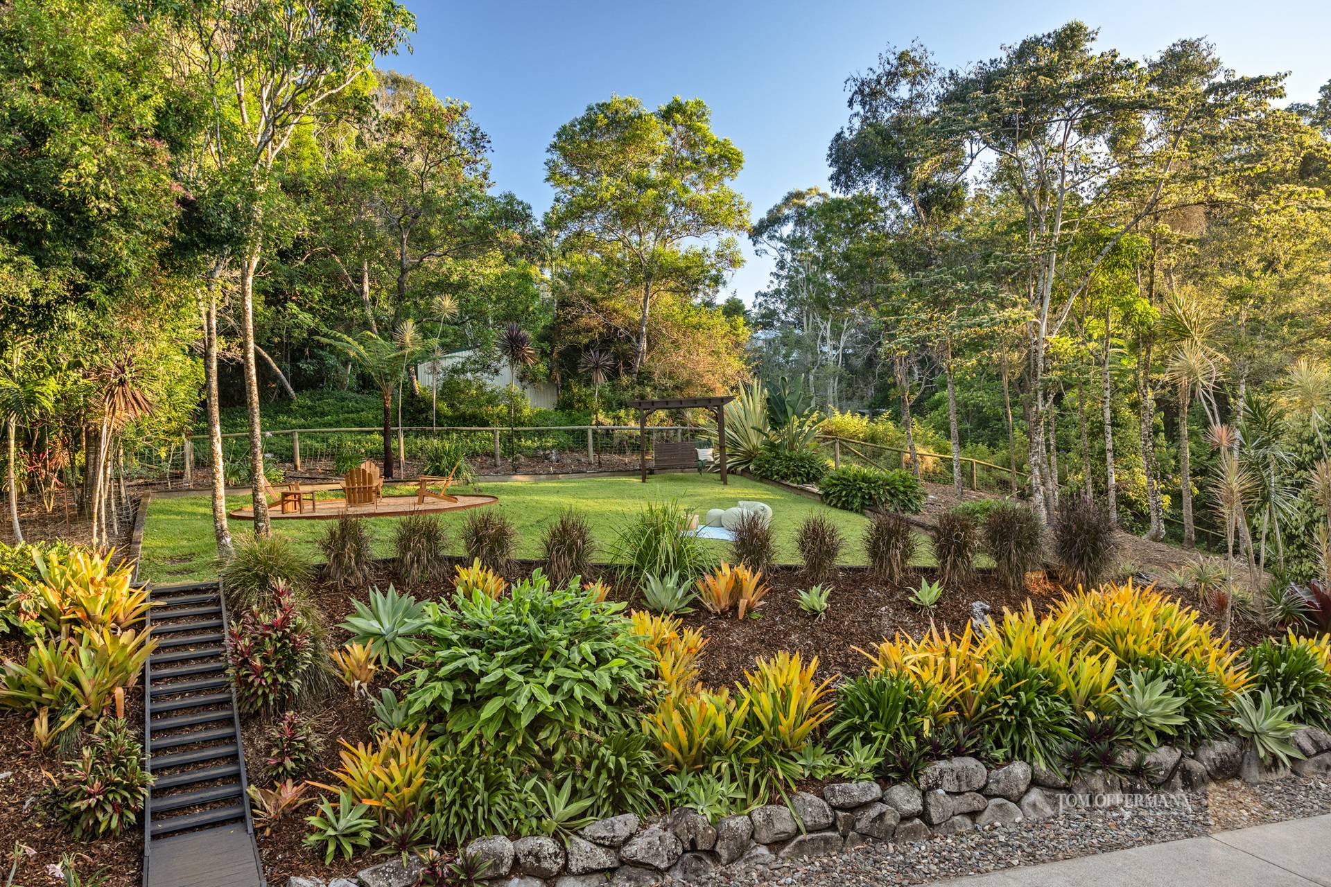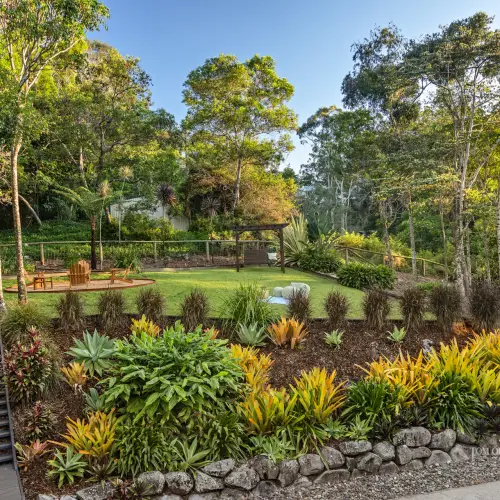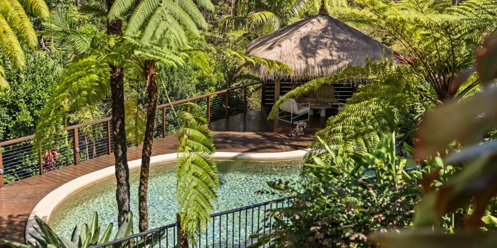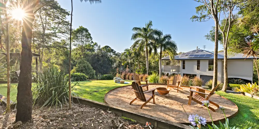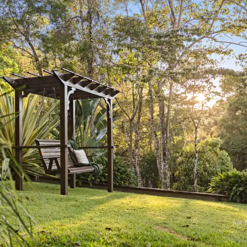 The bird-filled gardens are well established, the perfect blend of native flowering shrubs attracting bees and butterflies, tropical vegetation, majestic trees, and fruit trees providing fresh produce from garden to plate. There is also a chicken coop for genuine free-range eggs.