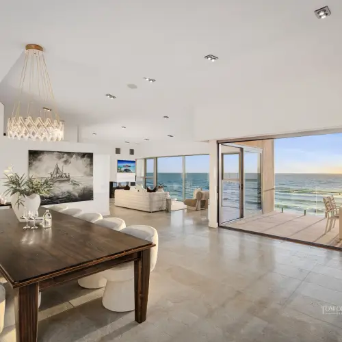 Inside be overwhelmed how the luminous quality of the ocean is matched by the interior as fresh and exhilarating as an early morning swim. It's vivacious, effortlessly cool yet quintessentially mid-century modern as tomorrow. There are voluminous double height spaces, walls of massive panes and disappearing doors, endless travertine throughout, all forming the heart of the residence and mimicked alfresco.