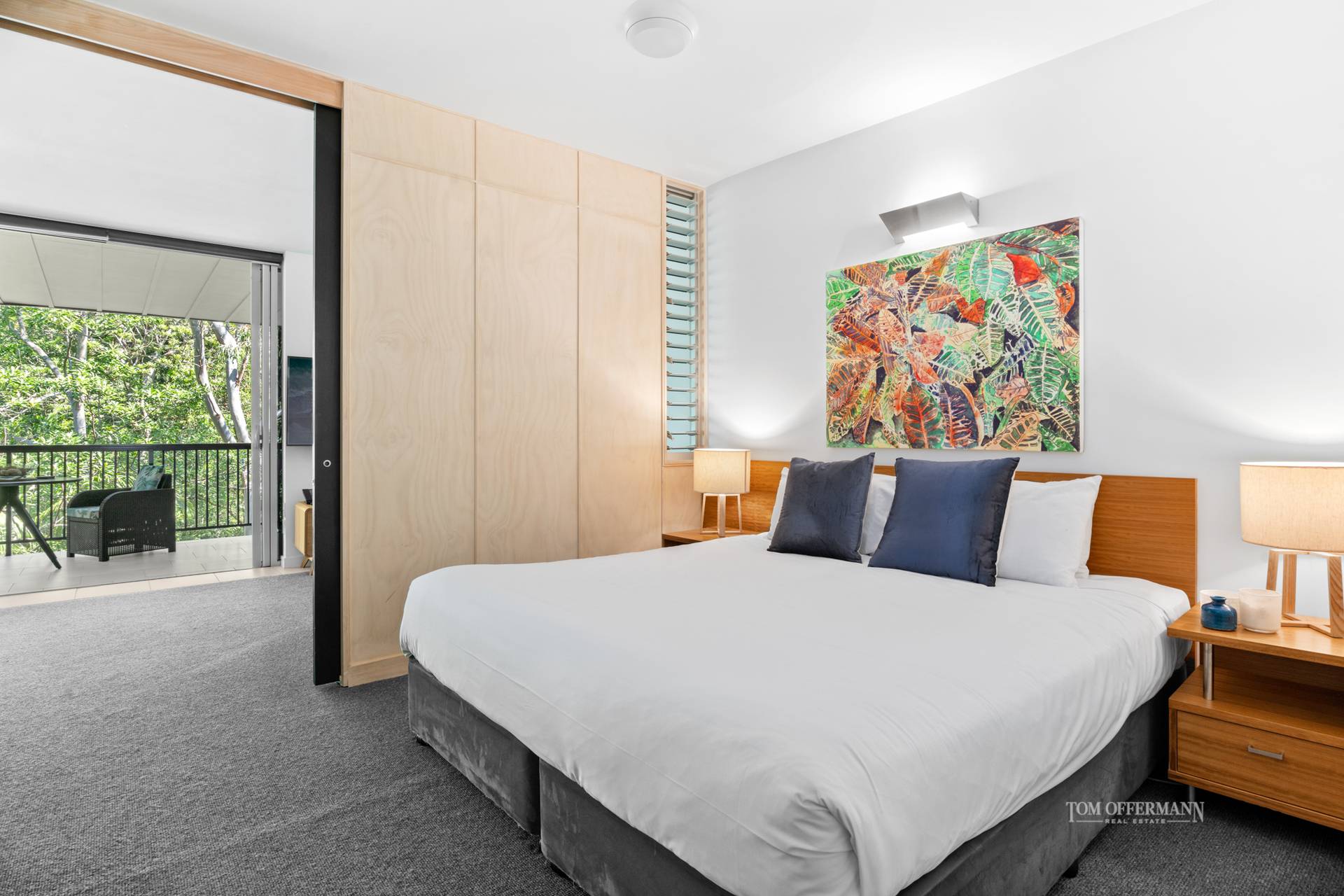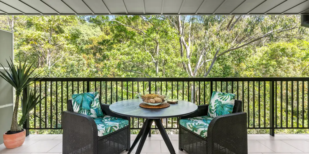 Open the sliding doors completely and indoors connects seamlessly with the expansive albeit it larger-than-most terrace, with rattan lounge and dining setting. Easy to relax and appreciate the apartment is seemingly perched amongst lush rainforest, the serenity is palpable and there's an alchemy of salty breezes.