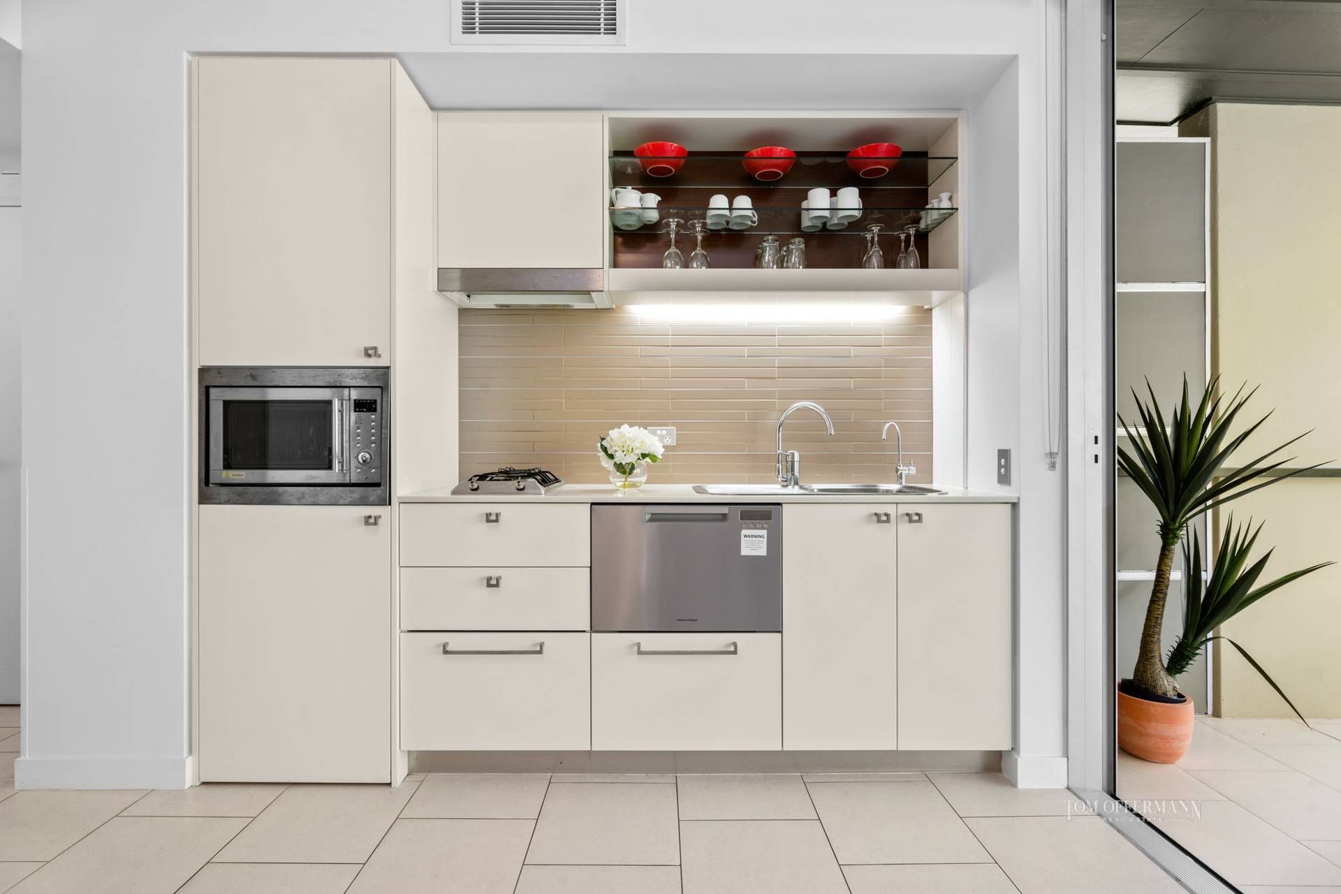 The galley-style kitchen has every accoutrement and appliance necessary even if friends drop by for pre-dinner aperitifs and canapes.