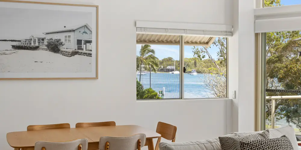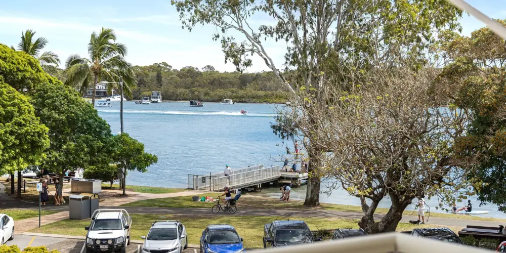- Features: nth-facing from Noosa River mouth along Noosa River; top floor single level apartment one of four in front row; tiled throughout; ducted aircon/fans; plantation shutters & auto blinds