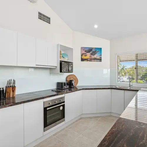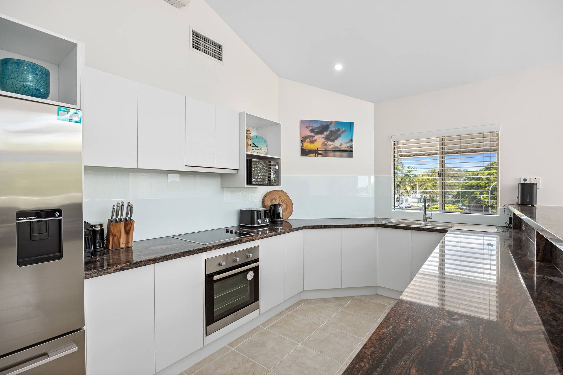 Central to the living space is a well-designed kitchen with black stone-topped cabinetry. Naturally it has the latest dishwasher, microwave, cooktop, oven, refrigerator and all the necessary accoutrements for top drawer culinary creations or just snacks to match the perfect sunsets!